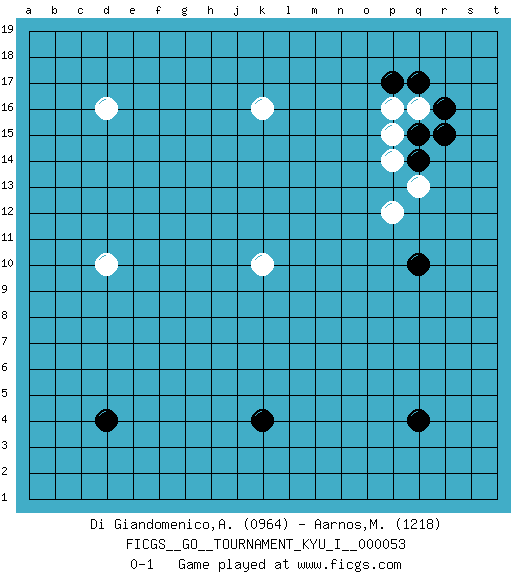 Last move : 0-1 2014 July 8 12:25:50 [Event "FICGS__GO__TOURNAMENT_KYU_I__000053"] [Site "FICGS"] [Date "2014.04.26"] [Round "1"] [Black "Di Giandomenico,Alfonso"] [White "Aarnos,Mikko"] [Result "0-1"] [Rating 1 "0964"] [Rating 2 "1218"] 1.d4 q16 2.k4 d16 3.q10 k16 4.q4 d10 5.q15 p15 6.q14 p14 7.r16 q13 8.q17 p16 9.r15 k10 10.p17 p12 0-1 This go game has been lost on time (started : 2014.04.26 1:29:5) Here are the names of the openings (joseki) played in the four corners : Corner q16 : q16 q15 Hoshi (Hwajeom, Seongjeom, Xingwei`) 4-4 Point. The star or hoshi (4-4) point, emphasizing influence at the potential expense of territory. Player White won this Go (weiqi, baduk) game. Follow this game move after move (download)Beware of the clumsy double contact. (Anonymous) There are 10 types of people in this world: those who understand binary and those who don't. (Anonymous)