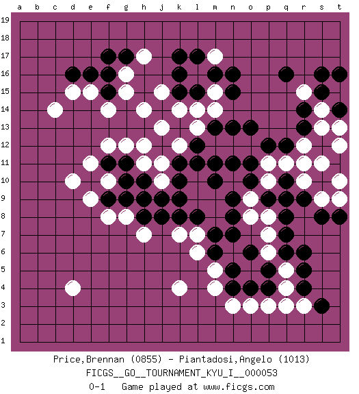 Last move : 0-1 2014 December 10 1:19:7 [Event "FICGS__GO__TOURNAMENT_KYU_I__000053"] [Site "FICGS"] [Date "2014.04.26"] [Round "1"] [Black "Price,Brennan"] [White "Piantadosi,Angelo"] [Result "0-1"] [Rating 1 "0855"] [Rating 2 "1013"] 1.q16 d4 2.d16 q4 3.k17 k4 4.q10 d10 5.k10 c14 6.f17 f14 7.j14 h12 8.j12 j11 9.k11 j10 10.j9 h9 11.j8 h7 12.h8 g8 13.h10 h11 14.g9 f8 15.f9 e9 16.f11 g12 17.g11 f12 18.l8 l7 19.m7 l6 20.m6 m5 21.n5 m4 22.n4 n3 23.r6 p6 24.q7 p7 25.q8 o9 26.o11 m8 27.n8 m9 28.n9 l9 29.k8 o8 30.n7 n10 31.m10 l10 32.m11 k12 33.l11 j13 34.k9 k7 35.e10 e11 36.h9 f10 37.g10 p10 38.o10 p11 39.p9 p8 40.q9 o12 41.n11 m14 42.p12 q11 43.q12 r11 44.o13 n12 45.m13 m12 46.l12 l13 47.n13 k14 48.l15 l14 49.n15 m15 50.m16 l16 51.k15 j15 52.k16 m17 53.n16 h14 54.l17 r12 55.r13 s13 56.r14 s14 57.s15 t15 58.t16 r15 59.t14 t13 60.s12 t15 61.s16 s11 62.r4 q5 63.r5 r3 64.s3 q3 65.q6 r10 66.r9 s9 67.s8 t10 68.t8 t9 69.t14 t12 70.p5 o5 71.p4 p3 72.o4 o3 73.o6 d15 74.e16 e15 75.f15 g15 76.f16 g16 77.g17 h17 0-1 This go game has been lost on time (started : 2014.04.26 1:29:5) Here are the names of the openings (joseki) played in the four corners : Corner d16 : d16 c14 Hoshi (Hwajeom, Seongjeom, Xingwei`) 4-4 Point. The star or hoshi (4-4) point, emphasizing influence at the potential expense of territory. Ikken Kakari (Hankan Keolch'im, Yi Gua`jiao~, 1-Space Low Approach). White 2 is the standard approach move to the 4-4. Corner d4 : d4 j9 Hoshi (Hwajeom, Seongjeom, Xingwei`) 4-4 Point. The star or hoshi (4-4) point, emphasizing influence at the potential expense of territory. Corner q4 : q4 l8 Hoshi (Hwajeom, Seongjeom, Xingwei`) 4-4 Point. The star or hoshi (4-4) point, emphasizing influence at the potential expense of territory. Player White won this Go (weiqi, baduk) game. Follow this game move after move (download)The L-group is dead. (Anonymous) All art requires courage. (Anne Tucker)