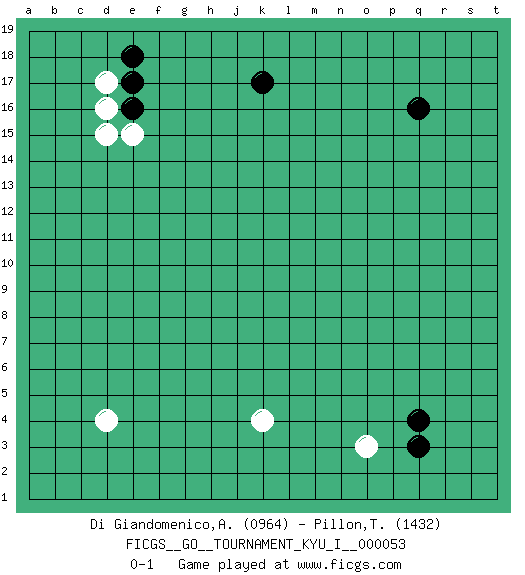 Last move : 0-1 2014 June 18 23:28:5 [Event "FICGS__GO__TOURNAMENT_KYU_I__000053 "] [Site "FICGS"] [Date "2014.04.26"] [Round "1"] [Black "Di Giandomenico,Alfonso "] [White "Pillon,Thibault "] [Result "0-1"] [Rating 1 "0964"] [Rating 2 "1432"] 1.q16 d4 2.q4 d17 3.k17 o3 4.q3 k4 5.e17 d16 6.e16 d15 7.e18 e15 0-1 This go game has been lost on time (started : 2014.04.26 1:29:5) Here are the names of the openings (joseki) played in the four corners : Corner q4 : q4 o3Hoshi (Hwajeom, Seongjeom, Xingwei`) 4-4 Point. The star or hoshi (4-4) point, emphasizing influence at the potential expense of territory.Ikken Kakari (Hankan Keolch'im, Yi Gua`jiao~, 1-Space Low Approach). White 2 is the standard approach move to the 4-4. Corner d16 : d17 e17Komoku (Somok, Xiao~mu`) 3-4 Point. The komoku (3-4) point is the traditional corner enclosure move.. Corner d4 : d4 0-1Hoshi (Hwajeom, Seongjeom, Xingwei`) 4-4 Point. The star or hoshi (4-4) point, emphasizing influence at the potential expense of territory. Player White won this Go (weiqi, baduk) game.Follow this game move after move (download ) Keep away from thickness. (Anonymous) Waiting for chance ? Play in casinos. (FICGS proverb)