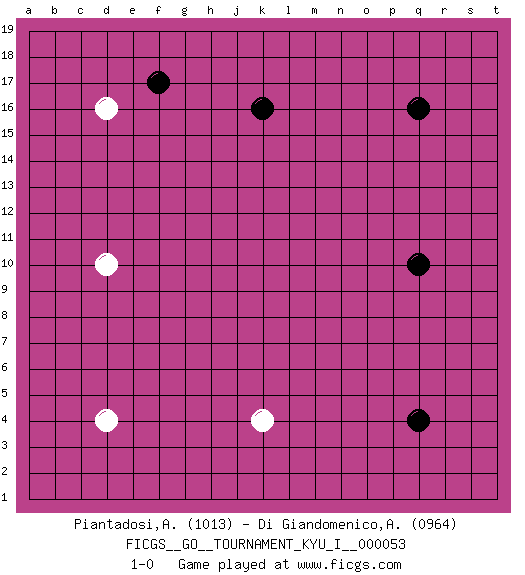 Last move : 1-0 2014 June 18 23:28:5 [Event "FICGS__GO__TOURNAMENT_KYU_I__000053"] [Site "FICGS"] [Date "2014.04.26"] [Round "1"] [Black "Piantadosi,Angelo"] [White "Di Giandomenico,Alfonso"] [Result "1-0"] [Rating 1 "1013"] [Rating 2 "0964"] 1.q16 d4 2.q4 d16 3.q10 d10 4.k16 k4 5.f17 1-0 This go game has been lost on time (started : 2014.04.26 1:29:5) Here are the names of the openings (joseki) played in the four corners : Corner d16 : d16 f17 Hoshi (Hwajeom, Seongjeom, Xingwei`) 4-4 Point. The star or hoshi (4-4) point, emphasizing influence at the potential expense of territory. Ikken Kakari (Hankan Keolch'im, Yi Gua`jiao~, 1-Space Low Approach). Black 2 is the standard approach move to the 4-4. Player Black won this Go (weiqi, baduk) game. Follow this game move after move (download)Capture what you cut off. (Anonymous) Crush them ! Make them suffer ! (General Grievous in Star Wars ep.3)