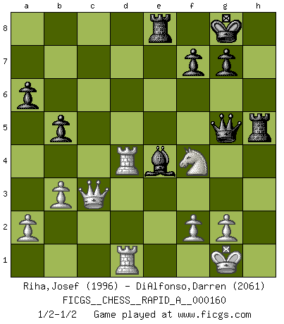 Last move : 1/2-1/2 2014 May 25 21:33:32 [Event "FICGS__CHESS__RAPID_A__000160"] [Site "FICGS"] [Date "2014.04.26"] [Round "1"] [White "Riha,Josef"] [Black "DiAlfonso,Darren"] [Result "1/2-1/2"] [WhiteElo "1996"] [BlackElo "2061"] 1.e4 e5 2.Nf3 Nc6 3.Bb5 a6 4.Ba4 Nf6 5.O-O Be7 6.Re1 b5 7.Bb3 d6 8.c3 O-O 9.h3 Bb7 10.d4 Re8 11.Ng5 Rf8 12.Nf3 Nd7 13.Nbd2 exd4 14.cxd4 Re8 15.Nf1 Na5 16.Bc2 Bf6 17.N1h2 c5 18.Ng4 cxd4 19.Nxd4 Bxd4 20.Qxd4 Rc8 21.Qd1 h5 22.Ne3 Nf6 23.b3 Nxe4 24.Bxe4 Bxe4 25.Qxh5 Nc6 26.Bb2 Ne5 27.Bd4 Bg6 28.Qe2 Nd3 29.Red1 Nf4 30.Qf3 Re4 31.Rd2 d5 32.Rad1 Rc6 33.Be5 Nxh3+ 34.Qxh3 Rxe5 35.Nxd5 Rh5 36.Qg3 Rc2 37.Rd4 Re2 38.Qf3 Re8 39.Qc3 Qg5 40.Nf4 Be4 1/2-1/2 Ruy Lopez : Closed Kingside Castling by player White (move 5) Kingside Castling by player Black (move 8) This chess game ended in a draw. Follow this game move after move (download)Tactics flow from a superior position. (Bobby Fischer) Es liegt in der Natur, vernüftig zu denken und unlogisch zu handeln. (Anatole France) La esencia del Ajedrez es pensar acerca de lo que el Ajedrez es. (David Bronstein) Même si l'adversaire joue le coup analysé précédemment, recommencez l'analyse en voyant la nouvelle position. Première règle de Blumenfeld Whenever people agree with me, I always feel I must be wrong. (Oscar Wilde)