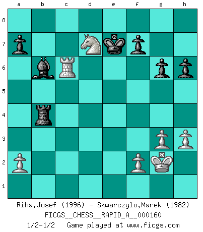 Last move : 1/2-1/2 2014 June 2 18:43:30 [Event "FICGS__CHESS__RAPID_A__000160"] [Site "FICGS"] [Date "2014.04.26"] [Round "1"] [White "Riha,Josef"] [Black "Skwarczylo,Marek"] [Result "1/2-1/2"] [WhiteElo "1996"] [BlackElo "1982"] 1.e4 c5 2.Nf3 Nc6 3.Bb5 g6 4.Bxc6 bxc6 5.O-O Bg7 6.Re1 Rb8 7.e5 Nh6 8.d4 cxd4 9.Qxd4 Qc7 10.Bxh6 Bxh6 11.b3 Bg7 12.Nbd2 O-O 13.Rad1 Rd8 14.Qh4 d6 15.exd6 Qxd6 16.Qxe7 Qxe7 17.Rxe7 Bf5 18.h3 Kf8 19.Rde1 Bc3 20.R7e2 Bb4 21.Rc1 Ba3 22.Rf1 Bxc2 23.Ne5 Bd3 24.Nxd3 Rxd3 25.Nc4 Bb4 26.Ne5 Rd6 27.Rc2 Rc8 28.Rfc1 Re8 29.Nc4 Rde6 30.Ne3 Ba3 31.Rb1 Bd6 32.Kf1 Bf4 33.Nc4 Bc7 34.Rbc1 Ke7 35.g3 Rd8 36.Nb2 R8d6 37.Na4 Bb6 38.Nc5 Re5 39.b4 Red5 40.Re2+ Kf8 41.Nb3 Rd1+ 42.Rxd1 Rxd1+ 43.Kg2 h6 44.Rc2 Rb1 45.Rxc6 Rb2 46.Nc5 Rxb4 47.Nd7+ Ke7 1/2-1/2 Sicilian : Nimzovich-Rossolimo attack (with ...g6, without ...d6) Kingside Castling by player White (move 5) Kingside Castling by player Black (move 12) This chess game ended in a draw. Follow this game move after move (download)The defensive power of a pinned piece is only imaginary. (Aaron Nimzovich) Ivan Sokolov treibt mich als Beifahrer an mit go Loeky go - . (Loek van Wely) El Rey es una pieza de pelea. ¡Usenlo!. (Wilhelm Steinitz) Je ne suis pas le dernier à jouer lâchement des coups douteux pendant le zeïtnot de l'adversaire pour l'achever: en effet les coups qui font le plus peur sont ceux que l'on ne comprend pas. Je me fais souvent peur quand je joue. (Un professeur anonyme) Life is like a play: it's not the length but the excellence of the acting that matters. (Seneca)