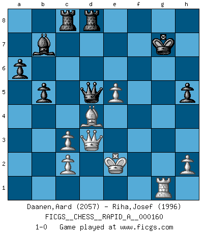 Last move : 1-0 2014 May 9 21:8:41 [Event "FICGS__CHESS__RAPID_A__000160"] [Site "FICGS"] [Date "2014.04.26"] [Round "1"] [White "Daanen,Aard"] [Black "Riha,Josef"] [Result "1-0"] [WhiteElo "2057"] [BlackElo "1996"] 1.Nc3 d5 2.e4 Nf6 3.e5 Nfd7 4.d4 e6 5.f4 c5 6.Nf3 Nc6 7.Be3 cxd4 8.Nxd4 Bc5 9.Qd2 O-O 10.O-O-O a6 11.Nb3 Bb4 12.Bd3 b5 13.g4 Bb7 14.Rhg1 Rc8 15.Rg3 d4 16.Nxd4 Bxc3 17.bxc3 Qa5 18.Qe1 Nxd4 19.Bxd4 Rfd8 20.Rh3 Qa3+ 21.Kd2 h6 22.g5 h5 23.Qe3 Nc5 24.g6 Nxd3 25.gxf7+ Kxf7 26.Qxd3 Qa5 27.Ke2 Qxa2 28.f5 Qd5 29.fxe6+ Qxe6 30.Rg3 Kg8 31.Rg6 Qd5 32.Rxg7+ Kxg7 33.Rg1+ 1-0 Dunst (Sleipner, Heinrichsen) Opening Kingside Castling by player Black (move 9) Queenside Castling by player White (move 10) Player White won this chess game. Follow this game move after move (download)Of Chess it has been said that life is not long enough for it, but that is the fault of life, not Chess. (William Ewart Napier) Als ich elf wurde, wurde ich einfach gut. (Robert James Fischer) Fischer no está bajo la obligación de nadie. (Joseph Platz) Les échecs sont un jeu terrible. Si vous n'avez pas le centre, votre adversaire a une position plus libre. Par contre, si vous avez le centre, alors vous avez vraiment quelque chose pour laquelle vous inquiéter ! (Siegbert Tarrasch) He who fights with monsters should be careful lest he thereby become a monster. (Friedrich Nietzsche, Beyond Good and Evil)