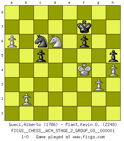 Last move : 1-0 2007 June 27 18:34:28 [Event "FICGS__CHESS__WCH_STAGE_2_GROUP_03__000001"] [Site "FICGS"] [Date "2007.02.15"] [Round "1"] [White "Gueci,Alberto"] [Black "Plant,Kevin D."] [Result "1-0"] [WhiteElo "1786"] [BlackElo "2248"] 1.e4 e5 2.Nf3 Nc6 3.Bb5 a6 4.Ba4 Nf6 5.O-O Be7 6.Re1 b5 7.Bb3 O-O 8.c3 d5 9.exd5 Nxd5 10.Nxe5 Nxe5 11.Rxe5 c6 12.d4 Bd6 13.Re1 Qh4 14.g3 Qh3 15.Be3 Bg4 16.Qd3 Bf5 17.Qe2 Bg4 18.Qf1 Qh5 19.Nd2 Rfe8 20.Bc2 Bf5 21.Bxf5 Qxf5 22.Rac1 h5 23.a3 Qg4 24.Qe2 Qg6 25.Qf3 Bc7 26.Nb3 Bb6 27.Re2 Re6 28.Rce1 Rf6 29.Qg2 Re8 30.Bc1 Rfe6 31.Qf3 Rxe2 32.Rxe2 Re6 33.h4 Bd8 34.Kh2 Rf6 35.Qh1 Re6 36.Rxe6 Qxe6 37.Nc5 Qe2 38.Kg2 a5 39.Qh3 Nf6 40.Qf5 Ng4 41.Nd3 Bc7 42.Qf3 Qc2 43.Bf4 Bxf4 44.Nxf4 g6 45.Qe2 Qxe2 46.Nxe2 a4 47.c4 bxc4 48.Nc3 Nh6 49.Nxa4 Nf5 50.Nb6 Nxd4 51.Nxc4 f6 52.a4 Kf7 53.a5 Nb5 54.a6 Ke6 55.Kf3 Kd7 56.Ke4 Ke6 57.Na3 Na7 58.f4 c5 59.f5+ gxf5+ 60.Kf4 Nc8 61.Nc4 Na7 62.Ne3 Nc6 63.Nxf5 Kf7 64.Nd6+ 1-0 Ruy Lopez : Closed, 7...O-O Kingside Castling by player White (move 5) Kingside Castling by player Black (move 7) Player White won this chess game. Follow this game move after move (download)In Chess, just as in life, today's bliss may be tomorrow's poison. (Assaic) Es ist im Leben wie im Schachspiel. Wir entwerfen einen Plan, dieser bleibt jedoch bedingt durch das, was im Schachspiel dem Gegner, im Leben dem Schicksal zu tun belieben wird. (Arthur Schopenhauer) Con el tiempo, empecé a progresar en partidas decisivas. Tal vez porque me di cuenta de una simple verdad: no solo estaba yo nervioso sino también mi oponente. (Mikhail Tal) Lorsque vous vous retrouvez devant une position atroce, ne tendez pas un ultime piège dérisoire avec l'intention d'abandonner si l'adversaire le déjoue ! Faites-vous plutôt un devoir de résister comme si votre vie en dépendait. Jouez le coup qui vous déplairait au centuple si vous étiez dans la peau de votre tortionnaire ! Convictions are more dangerous enemies of truth than lies. (Friedrich Nietzsche)