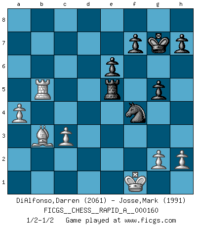 Last move : 1/2-1/2 2014 June 1 11:59:27 [Event "FICGS__CHESS__RAPID_A__000160"] [Site "FICGS"] [Date "2014.04.26"] [Round "1"] [White "DiAlfonso,Darren"] [Black "Josse,Mark"] [Result "1/2-1/2"] [WhiteElo "2061"] [BlackElo "1991"] 1.d4 Nf6 2.c4 g6 3.Nc3 d5 4.cxd5 Nxd5 5.e4 Nxc3 6.bxc3 Bg7 7.Bc4 c5 8.Ne2 O-O 9.O-O Nc6 10.Be3 Qc7 11.Rc1 Rd8 12.Bf4 Qd7 13.dxc5 Qe8 14.Bd5 Ne5 15.Nd4 e6 16.Bb3 Qe7 17.Be3 b6 18.cxb6 Ba6 19.bxa7 Rxa7 20.f4 Bxf1 21.Kxf1 Bh6 22.Qe2 Bxf4 23.Bxf4 Qf6 24.Qf2 Nd3 25.e5 Qxf4 26.Qxf4 Nxf4 27.Nc6 Rda8 28.Nxa7 Rxa7 29.Rd1 g5 30.Rd4 Kg7 31.Rb4 Ra5 32.a4 Rxe5 33.Rb5 1/2-1/2 King's Indian defense, 3.Nc3 Kingside Castling by player Black (move 8) Kingside Castling by player White (move 9) This chess game ended in a draw. Follow this game move after move (download)I like the moment when I break a man's ego. (Bobby Fischer) Es gibt Leute, die glauben, alles wäre vernünftig, was man mit einem ernsthaften Gesicht tut. (Georg Christoph Lichtenberg) ¿Quién es tu oponente esta tarde? Esta tarde mi oponente son las piezas negras. (Akiba Rubinstein) Tous ces prétendus hommes politiques sont les pions, les Cavaliers, les Tours ou les Fous d'une partie d'échecs qui se jouera tant qu'un hasard ne renversera pas l'échiquier. (Honoré de Balzac) Fortune favours the audacious. (Desiderius Erasmus)