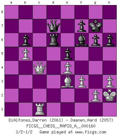Last move : 1/2-1/2 2014 May 11 15:53:13 [Event "FICGS__CHESS__RAPID_A__000160"] [Site "FICGS"] [Date "2014.04.26"] [Round "1"] [White "DiAlfonso,Darren"] [Black "Daanen,Aard"] [Result "1/2-1/2"] [WhiteElo "2061"] [BlackElo "2057"] 1.d4 Nf6 2.c4 g6 3.Nc3 d5 4.cxd5 Nxd5 5.e4 Nxc3 6.bxc3 Bg7 7.Bc4 c5 8.Ne2 Nc6 9.Be3 O-O 10.O-O Bg4 11.f3 Bd7 12.Rb1 Qc7 13.Qd2 Rad8 14.Rfc1 Bc8 15.Bf2 b6 16.Qe3 Na5 17.Bd3 e5 18.dxc5 Be6 19.cxb6 axb6 20.c4 Nxc4 21.Bxc4 Bxc4 22.a4 Rd6 23.h3 Rb8 24.Nc3 Qa7 25.Nb5 Bxb5 26.axb5 Qd7 27.Kh2 Bf6 28.Rc2 Rc8 29.Rxc8+ Qxc8 30.Ra1 Kg7 31.Qb3 Qc7 32.Be3 h6 33.Rc1 Qd7 34.Qc4 1/2-1/2 King's Indian defense, 3.Nc3 Kingside Castling by player Black (move 9) Kingside Castling by player White (move 10) This chess game ended in a draw. Follow this game move after move (download)Human affairs are like a Chess game: only those who do not take it seriously can be called good players. (Hung Tzu Ch'eng) Matt entspricht nicht immer den Tatsachen. (Savielly Grigorievitsch Tartakower) Cada Peón es potencialmente una Reina. (James Mason) Tout change constamment, y compris dans le monde des Echecs. (Botvinnik) You have to believe in yourself. (Sun Tzu)