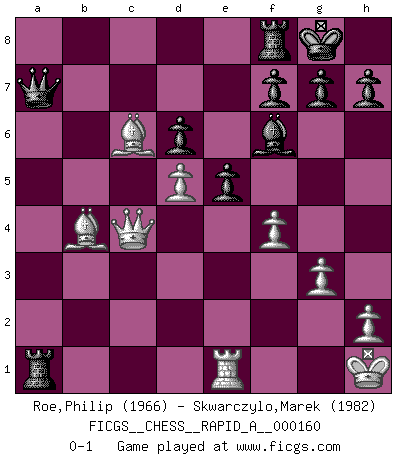 Last move : 0-1 2014 July 28 1:57:1 [Event "FICGS__CHESS__RAPID_A__000160"] [Site "FICGS"] [Date "2014.04.26"] [Round "1"] [White "Roe,Philip"] [Black "Skwarczylo,Marek"] [Result "0-1"] [WhiteElo "1966"] [BlackElo "1982"] 1.e4 c5 2.Nf3 Nc6 3.d4 cxd4 4.Nxd4 e5 5.Nb5 d6 6.c4 Be7 7.N1c3 a6 8.Na3 Nf6 9.Nc2 Be6 10.Bd3 Rc8 11.O-O Na5 12.b3 b5 13.Nb4 bxc4 14.bxc4 Nxc4 15.Nbd5 Nxd5 16.Nxd5 O-O 17.Rb1 Bxd5 18.exd5 Nb6 19.Bxa6 Ra8 20.Bb5 Rxa2 21.Qb3 Ra7 22.Bc6 Nd7 23.Be3 Ra5 24.Bd2 Ra6 25.Qc4 Nc5 26.g3 Qc7 27.f4 Bf6 28.Bb4 Qa7 29.Rbe1 Nd3 30.Kh1 Nxe1 31.Rxe1 Ra1 0-1 This chess game has been lost on time (started : 2014.04.26 23:56:43) Sicilian : Labourdonnais-Loewenthal (Kalashnikov) variation Kingside Castling by player White (move 11) Kingside Castling by player Black (move 16) Player Black won this chess game. Follow this game move after move (download)I'm not a materialistic person, in that, I don't suffer the lack or loss of money. The absence of worldly goods I don't look back on. For Chess is a way I can be as materialistic as I want without having to sell my soul. (Jamie Walter Adams) Die meiste Zeit treffe ich auf Gegner, die meine Enkel sein könnten. Ich bin da, um ihnen zu zeigen, dass sie von mir noch einiges lernen können. (Viktor Kortschnoi) Nos gusta pensar. (Gary Kasparov) D'abord les bases : Jouez et étudiez, puis étudiez et jouez, ensuite jouez et étudiez, puis étudiez et jouez. Deuxièmement : Donnez toujours le meilleur de vous-même ! (Ken Smith) If computers get too powerful, we can organize them into committees. That'll do them in. (Anonymous)