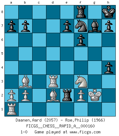 Last move : 1-0 2014 July 21 1:27:29 [Event "FICGS__CHESS__RAPID_A__000160"] [Site "FICGS"] [Date "2014.04.26"] [Round "1"] [White "Daanen,Aard"] [Black "Roe,Philip"] [Result "1-0"] [WhiteElo "2057"] [BlackElo "1966"] 1.e4 c6 2.d4 d5 3.Nd2 g6 4.Ngf3 Bg7 5.Bd3 Nh6 6.O-O O-O 7.c3 f6 8.Re1 Nf7 9.h4 Bg4 10.Qb3 Qd7 11.Nh2 Be6 12.Qc2 c5 13.exd5 Bxd5 14.c4 Bxg2 15.Kxg2 cxd4 16.c5 Nc6 17.Bc4 Nce5 18.Bb3 Qc6+ 19.Ndf3 d3 20.Qc3 Kh8 21.Qb4 Rac8 22.Bd2 g5 23.Qe4 Qxe4 24.Rxe4 Rxc5 25.Nxe5 Rxe5 26.Rd4 Re2 27.Rxd3 gxh4 28.Nf3 1-0 This chess game has been lost on time (started : 2014.04.26 23:56:43) Caro-Kann : 3.Nd2 Kingside Castling by player White (move 6) Kingside Castling by player Black (move 6) Player White won this chess game. Follow this game move after move (download)Nonsense was the last thing Fischer was interested in, as far as Chess was concerned. (Elie Agur) Dein Körper muss in Topform sein. Dein Schach verfällt, wenn dein Körper verfällt. Der Körper kann nicht vom Geist getrennt werden. (Robert James Fischer) El Ajedrez por encima de todo... ¡es una pelea!. (Emanuel Lasker) Un journaliste : 'Vous préférez avoir une dame de plus sur l'échiquier ou au lit ?' Boris Spassky : 'Ca dépend de la position.' All the biggest technological inventions created by man - the airplane, the automobile, the computer - says little about his intelligence, but speaks volumes about his laziness. (Mark Kennedy)