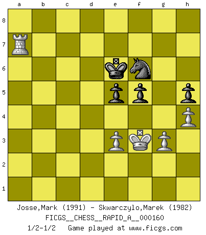 Last move : 1/2-1/2 2014 July 5 22:12:3 [Event "FICGS__CHESS__RAPID_A__000160"] [Site "FICGS"] [Date "2014.04.26"] [Round "1"] [White "Josse,Mark"] [Black "Skwarczylo,Marek"] [Result "1/2-1/2"] [WhiteElo "1991"] [BlackElo "1982"] 1.d4 d5 2.c4 c6 3.Nf3 dxc4 4.e3 b5 5.a4 e6 6.axb5 cxb5 7.b3 Bb4+ 8.Bd2 Bxd2+ 9.Nbxd2 a5 10.Ne5 Nf6 11.bxc4 b4 12.Be2 O-O 13.Bf3 Ra7 14.O-O Qc7 15.Qa4 Bd7 16.Nxd7 Nbxd7 17.Qc6 Qb8 18.c5 Rc8 19.Qa4 Qc7 20.Nc4 Rb8 21.Nxa5 b3 22.Qc6 b2 23.Qxc7 Rxc7 24.Rab1 Nxc5 25.dxc5 Rxc5 26.Nc6 Rb6 27.Rfd1 g6 28.g3 Kg7 29.h3 R5xc6 30.Bxc6 Rxc6 31.Rxb2 h5 32.Rb7 g5 33.Ra1 Ne4 34.R1a7 Nd6 35.Rd7 Kg6 36.Kg2 g4 37.h4 Rb6 38.Rd8 Kg7 39.Ra5 f5 40.Rda8 Ne4 41.R8a6 Rxa6 42.Rxa6 Kf6 43.Ra7 Nd6 44.Rd7 Ne4 45.Rd8 Kg6 46.Rd7 Nc5 47.Rc7 Ne4 48.f3 gxf3+ 49.Kxf3 Nd2+ 50.Kg2 Ne4 51.Rc6 Kf6 52.Rb6 Ke5 53.Rb5+ Kf6 54.Kf3 e5 55.Rb6+ Kf7 56.Rh6 Nf6 57.Rh8 Ke6 58.Ra8 Kd6 59.Ra6+ Ke7 60.Ra7+ Ke6 61.Ra6+ Kf7 62.Ra7+ Ke6 63.Ra6+ Kf7 64.Ra7+ Ke6 1/2-1/2 QGD Slav : 3.Nf3 Kingside Castling by player Black (move 12) Kingside Castling by player White (move 14) 10 pieces endgame at move 49 : White KRPPP , Black KNPPP WHITE : King + 1 Rook 3 Pawns BLACK : King + 1 Knight 3 Pawns This chess game ended in a draw. Follow this game move after move (download)Nowadays, when you're not a grandmaster at 14, you can forget about it. (Anand Viswanathan) Ich war zu klein für die Schach-Schülermannschaft! (Woody Allen) Todavía soy una víctima del Ajedrez. Tiene toda la belleza del arte y mucho mas. No puede ser comercializado. El Ajedrez es mas puro que el arte en su posición social. (Marcel Duchamp) Les Cavaliers se révèlent fort utiles dans les positions fermées. D'habitude, les Fous sont un peu plus forts que les Cavaliers dans les positions ouvertes. Qu'on le veuille ou non, il restera toujours des exceptions ! This is where the fun begins. (Anakin Skywalker in Star Wars ep.3)