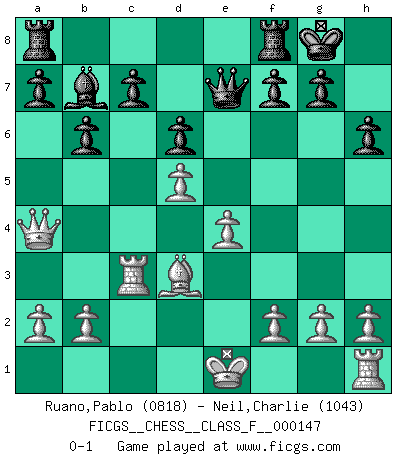 Last move : 0-1 2014 July 22 1:29:25 [Event "FICGS__CHESS__CLASS_F__000147"] [Site "FICGS"] [Date "2014.04.27"] [Round "1"] [White "Ruano,Pablo"] [Black "Neil,Charlie"] [Result "0-1"] [WhiteElo "0818"] [BlackElo "1043"] 1.d4 Nf6 2.c4 e6 3.Nc3 Bb4 4.Nf3 b6 5.Bg5 Bb7 6.e3 d6 7.Qa4+ Nc6 8.d5 exd5 9.Bxf6 Qxf6 10.Rc1 O-O 11.cxd5 Bxc3+ 12.Rxc3 Ne5 13.e4 h6 14.Nxe5 Qxe5 15.Bd3 Qe7 0-1 This chess game has been lost on time (started : 2014.04.27 0:41:5) Nimzo-Indian : Three knights variation Kingside Castling by player Black (move 10) Player Black won this chess game. Follow this game move after move (download)After black's reply to 1.e4 with 1..e5, leaves him always trying to get into the game. (Howard Staunton) Vom Schach wurde gesagt das Leben sei dafür nicht lange genug. Aber das ist der Fehler des Lebens, nicht des Schach'. (Irving Chernev) No es una movida, aún la mejor movida que tu debas buscar, sino un plan comprensible. (Eugene Znosko-Borovsky) A chaque perte on perd un peu de soi. (Joël Lautier) Computers make it easier to do a lot of things, but most of the things they make it easier to do don't need to be done. (Andy Rooney)