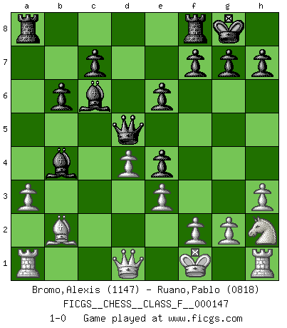 Last move : 1-0 2014 July 23 1:32:14 [Event "FICGS__CHESS__CLASS_F__000147"] [Site "FICGS"] [Date "2014.04.27"] [Round "1"] [White "Bromo,Alexis"] [Black "Ruano,Pablo"] [Result "1-0"] [WhiteElo "1147"] [BlackElo "0818"] 1.d4 Nf6 2.c4 e6 3.a3 d5 4.Nc3 Bd6 5.c5 Be7 6.h3 Nc6 7.e3 O-O 8.Nf3 Ne4 9.Nxe4 dxe4 10.Nh2 b6 11.cxb6 axb6 12.Bb5 Bb7 13.b4 Bxb4+ 14.Kf1 Qd5 15.Bxc6 Bxc6 16.Bb2 1-0 This chess game has been lost on time (started : 2014.04.27 0:41:5) Queen's pawn game Kingside Castling by player Black (move 7) Player White won this chess game. Follow this game move after move (download)I am still a victim of Chess. It has all the beauty of art and much more. It cannot be commercialized. Chess is much purer than art in its social position. (Marcel Duchamp) Ich verstehe den Grund nicht, warum die Aufteilung in Frauen und Männer überhaupt im Schach besteht. (Judith Polgar) Fischer deseaba darle a los Rusos una sopa de su propia medicina. (Larry Evans) Si je n'étais pas joueur d'échecs, je serais le meilleur dans quelque chose d'autre. (Anatoli Karpov) That's absurd. I love it. (Gregory House, House M.D.)