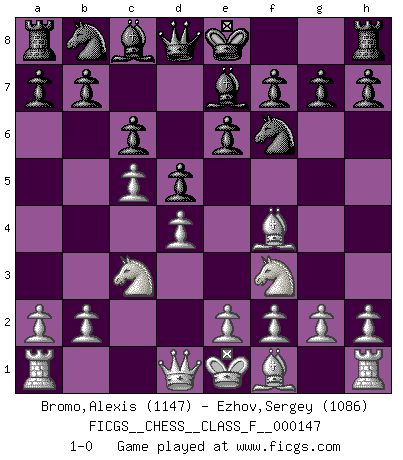 Last move : 1-0 2014 June 15 23:6:24 [Event "FICGS__CHESS__CLASS_F__000147"] [Site "FICGS"] [Date "2014.04.27"] [Round "1"] [White "Bromo,Alexis"] [Black "Ezhov,Sergey"] [Result "1-0"] [WhiteElo "1147"] [BlackElo "1086"] 1.d4 d5 2.c4 c6 3.Nc3 Nf6 4.Nf3 e6 5.c5 Be7 6.Bf4 1-0 This chess game has been lost on time (started : 2014.04.27 0:41:5) QGD Slav defense Player White won this chess game. Follow this game move after move (download)I am the best player in the world and I am here to prove it. (Bobby Fischer) Die Neutralität betrachte ich als eine schwere Krankheit. (Viktor Kortschnoi) Tu no necesitas jugar muy bien, únicamente ayudar a tu oponenet a que juegue muy mal. (Genrikh Chepukaitis) Une platitude souvent récitée à propos des Echecs est qu'une des choses les plus difficiles à réaliser est de gagner une position gagnante. Cela ne manque pas de sens mais, pour ma part, j'ai toujours trouvé plus difficile de gagner une position perdante. (Tim Krabbe) Luck is what you have left over after you give 100 percent. (Langston Coleman)