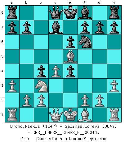 Last move : 1-0 2014 June 20 23:33:44 [Event "FICGS__CHESS__CLASS_F__000147"] [Site "FICGS"] [Date "2014.04.27"] [Round "1"] [White "Bromo,Alexis"] [Black "Salinas,Loreva"] [Result "1-0"] [WhiteElo "1147"] [BlackElo "0847"] 1.d4 e6 2.a3 d5 3.Nc3 Bd7 4.Nf3 c5 5.Bf4 Nc6 6.e3 c4 7.e4 Nf6 8.h3 dxe4 9.Ne5 Nxe5 10.Bxe5 1-0 This chess game has been lost on time (started : 2014.04.27 0:41:5) Queen's pawn Player White won this chess game. Follow this game move after move (download)There is only one thing Fischer does in Chess without pleasure: to lose ! (Boris Spassky) Im Internet Chess Club betrug mein Rating vorübergehend 3350 ELO-Punkte. (Sergej Karjakin) El Ajedrez es un juego de pelea el cual es puramente intelectual e incluye la suerte. (Richard Reti) Le thème de l'attaque double intervient d'une manière ou d'une autre dans l'immense majorité des combinaisons. (Youri Averbakh) Experience is the name we all give to our mistakes. (Oscar Wilde)