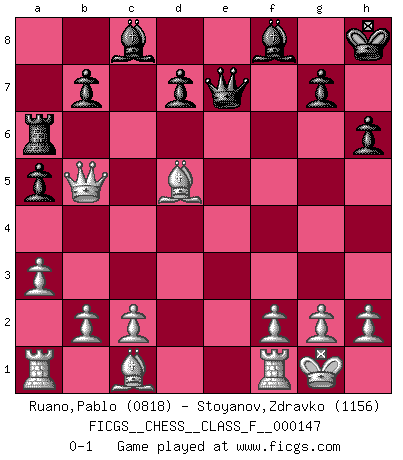 Last move : 0-1 2014 August 5 3:23:42 [Event "FICGS__CHESS__CLASS_F__000147"] [Site "FICGS"] [Date "2014.04.27"] [Round "1"] [White "Ruano,Pablo"] [Black "Stoyanov,Zdravko"] [Result "0-1"] [WhiteElo "0818"] [BlackElo "1156"] 1.e4 c5 2.Nf3 a6 3.d4 cxd4 4.Nxd4 e5 5.Nf3 Nc6 6.Bc4 h6 7.O-O Nf6 8.Nc3 Bb4 9.Nd5 Nxd5 10.exd5 Ne7 11.d6 Nf5 12.Nxe5 Nxd6 13.Bb3 O-O 14.Qd4 a5 15.a3 Nb5 16.Qf4 Bd6 17.Bxf7+ Kh8 18.Ng6+ Kh7 19.Nxf8+ Bxf8 20.Qf5+ Kh8 21.Qxb5 Qe7 22.Bd5 Ra6 0-1 Sicilian : O'Kelly variation Kingside Castling by player White (move 7) Kingside Castling by player Black (move 13) Player Black won this chess game. Follow this game move after move (download)You know, comrade Pachman, I don't enjoy being a Minister, I would rather play Chess like you. (Che Guevara) Wie, soll nun auch die Opposition abgeschafft werden? Ja, es tut mir leid, Ihnen diesen Schmerz nicht ersparen zu können. (Aaron Nimzowitsch) El Ajedrez es un cuento de Hadas de las 1001 metidas de pata. (Savielly Tartakower) Des idées, des idées, j'en ai cent, j'en ai mille. Des bonnes, des mauvaises, applicables, irréalisables... Il suffit de faire le tri ! (Roos) Experiences are the keys to life. (Daniel Parmet)