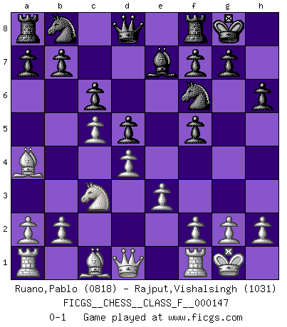Last move : 0-1 2014 July 30 14:19:52 [Event "FICGS__CHESS__CLASS_F__000147"] [Site "FICGS"] [Date "2014.04.27"] [Round "1"] [White "Ruano,Pablo"] [Black "Rajput,Vishalsingh"] [Result "0-1"] [WhiteElo "0818"] [BlackElo "1031"] 1.d4 d5 2.c4 Bf5 3.Nc3 Nf6 4.e3 Nc6 5.Nf3 e6 6.c5 Be7 7.Bb5 O-O 8.O-O Nb8 9.Nh4 c6 10.Ba4 h6 11.Nxf5 exf5 0-1 This chess game has been lost on time (started : 2014.04.27 0:41:5) QGD : Grau (Sahovic) defense Kingside Castling by player Black (move 7) Kingside Castling by player White (move 8) Player Black won this chess game. Follow this game move after move (download)An attack on the wing should be met by play in the center. (Nimzovitch) Je mehr wir mit Computern analysieren, desto mehr glauben wir an Verteidigung. (Vladimir Kramnik) Las leyes del Ajedrez no permiten una libre elección: tienes que mover quieras o no. (Emanuel Lasker) Un journaliste : 'Vous préférez avoir une dame de plus sur l'échiquier ou au lit ?' Boris Spassky : 'Ca dépend de la position.' CHESS, n. f. [echecs, Fr.] A nice and abstruse game, in which two sets of puppets are moved in opposition to each other. (Dr Samuel Johnson, A Dictionary Of The English Language, 1755)