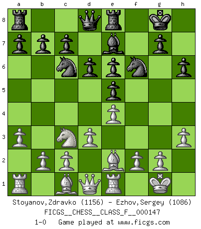 Last move : 1-0 2014 July 9 0:29:25 [Event "FICGS__CHESS__CLASS_F__000147"] [Site "FICGS"] [Date "2014.04.27"] [Round "1"] [White "Stoyanov,Zdravko"] [Black "Ezhov,Sergey"] [Result "1-0"] [WhiteElo "1156"] [BlackElo "1086"] 1.e4 e5 2.Nf3 Nf6 3.d3 Nc6 4.a3 d6 5.h3 Be7 6.Be2 O-O 7.O-O Re8 8.Nc3 Be6 9.Ng5 h6 10.Nxe6 fxe6 11.Re1 1-0 Petrov's defense Kingside Castling by player Black (move 6) Kingside Castling by player White (move 7) Player White won this chess game. Follow this game move after move (download)Half the variations which are calculated in a tournament game turn out to be completely superfluous. Unfortunately, no one knows in advance which half. (Jan Tinman) Ein Schachgenie ist jemand der verdammt gut Schach spielt. (Jonathan Levitt) Ayuda a tus piezas para que ellas te puedan ayudar. (Paul Morphy) Les échecs sont un jeu par leur forme, un art par leur essence et une science par sa difficulté d'acquisition. Ils peuvent vous procurer autant de plaisir qu'un bon livre ou une belle musique, mais vous n'aurez une réelle joie que si vous arrivez à bien jouer. (Tigran Petrosian) Tomorrow's what you make of it. (Horatio Caine, C.S.I. Miami)