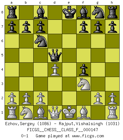 Last move : 0-1 2014 June 15 23:6:24 [Event "FICGS__CHESS__CLASS_F__000147"] [Site "FICGS"] [Date "2014.04.27"] [Round "1"] [White "Ezhov,Sergey"] [Black "Rajput,Vishalsingh"] [Result "0-1"] [WhiteElo "1086"] [BlackElo "1031"] 1.e4 e5 2.f4 exf4 3.Nf3 Nc6 4.d4 d5 5.exd5 Qxd5 0-1 This chess game has been lost on time (started : 2014.04.27 0:41:5) King's knight's gambit Player Black won this chess game. Follow this game move after move (download)When you absolutely don't know what to do anymore, it is time to panic. (John van der Wiel) Der Vorposten provoziert a) eine Basis für neue Angriffe und b) eine Schwächung der gegnerischen Widerstandskraft in der fraglichen Linie. (Aaron Nimzowitsch) Cuando estes solo, cuando te sientas un extraño en el mundo, juega al Ajedrez. Esto levantará tu espiritu y será tu consejero de guerra. (Aristóteles) Il (Jacob Murray) ne joue pas pour le bon coup, mais pour le meilleur. (Eloi Relange) If you don't practice you don't deserve to win. (Andre Agassi)