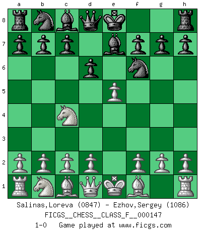 Last move : 1-0 2014 July 1 0:9:39 [Event "FICGS__CHESS__CLASS_F__000147"] [Site "FICGS"] [Date "2014.04.27"] [Round "1"] [White "Salinas,Loreva"] [Black "Ezhov,Sergey"] [Result "1-0"] [WhiteElo "0847"] [BlackElo "1086"] 1.e4 e5 2.Nf3 Nf6 3.Nxe5 d6 4.Nc4 Be7 5.e5 1-0 This chess game has been lost on time (started : 2014.04.27 0:41:5) Petrov : Paulsen attack Player White won this chess game. Follow this game move after move (download)You have to have the fighting spirit. You have to force moves and take chances. (Bobby Fischer) Matt entspricht nicht immer den Tatsachen. (Savielly Grigorievitsch Tartakower) El tablero es el mundo, las piezas es el fenomeno del universo, las reglas del juego son lo que llamamos leyes de la naturaleza y el jugador del lado opuesto, se encuentra oculto a nuestra vista. (Thomas Huxley) Si rien de grave n'est détecté lors de l'analyse d'une position, on joue alors le coup. Seconde règle de Blumenfeld. Unless I accept my faults I will most certainly doubt my virtues. (Hugh Prather)