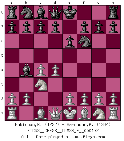 Last move : 0-1 2014 June 6 22:51:14 [Event "FICGS__CHESS__CLASS_E__000172"] [Site "FICGS"] [Date "2014.04.27"] [Round "1"] [White "Bakirhan,Recep"] [Black "Barradas,Anderson"] [Result "0-1"] [WhiteElo "1237"] [BlackElo "1334"] 1.d4 Nf6 2.c4 e6 3.Nc3 Bb4 0-1 This chess game has been lost on time (started : 2014.04.27 0:43:16) Nimzo-Indian defense Player Black won this chess game. Follow this game move after move (download)Chess is the art which expresses the science of logic. (Mikhail Botvinnik) Im Leben werden Partien nie so unstrittig gewonnen wie im Spiel (Emanuel Lasker) Cuando no sepas que mover, espera por una idea que se le venga a la la cabeza de tu oponente. Tenlo por seguro de que esa idea estará incorrecta. (Siegbert Tarrasch) J'ai vu le vaincu d'Echecs jouer des années durant dans l'espoir de la fête de la victoire. Car tu es plus riche de ce qu'elle existe si même elle n'est point pour toi. Ainsi de la perle du fond des mers. (Antoine de Saint-Exupéry) There are two major products that came out of Berkeley: LSD and UNIX. We do not believe this is to be a coincidence. (Jeremy S. Anderson)