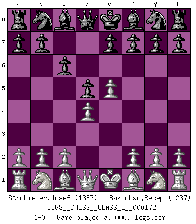 Last move : 1-0 2014 June 9 10:51:17 [Event "FICGS__CHESS__CLASS_E__000172"] [Site "FICGS"] [Date "2014.04.27"] [Round "1"] [White "Strohmeier,Josef"] [Black "Bakirhan,Recep"] [Result "1-0"] [WhiteElo "1387"] [BlackElo "1237"] 1.e4 c6 2.d4 d5 3.e5 1-0 This chess game has been lost on time (started : 2014.04.27 0:43:16) Caro-Kann : Advance variation Player White won this chess game. Follow this game move after move (download)No other master has such a terrific will to win. At the board he radiates danger, and even the strongest opponents tend to freeze, like rabbits when they smell a panther. Even his weaknesses are dangerous. As white, his opening game is predictable - you can make plans against it - but so strong that your plans almost never work. In the middle game his precision and invention are fabulous, and in the end game you simply cannot beat him. (Anonymous German Expert) Wer der Ansicht ist, daß alle Schachspieler verrückt sind, wird durch Studium des Lebens von Emil Josef Diemer nicht auf andere Gedanken kommen. (Hans Ree) La mitad de las variaciones que son calculadas en una partida de torneo, resultan ser completamente superfluas. Desafortunadamente, nadie sabe por adelantado cual mitad. (Jan Tinman) Les échecs sont un jeu terrible. Si vous n'avez pas le centre, votre adversaire a une position plus libre. Par contre, si vous avez le centre, alors vous avez vraiment quelque chose pour laquelle vous inquiéter ! (Siegbert Tarrasch) Warrior pose battles inner weakness and wins focus. You see that there is no war within you. You're on your own side, and you are your own strength. (Terri Guillemets)