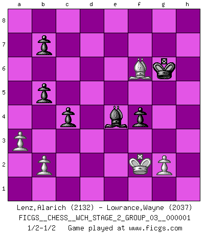 Last move : 1/2-1/2 2007 July 11 4:38:0 [Event "FICGS__CHESS__WCH_STAGE_2_GROUP_03__000001"] [Site "FICGS"] [Date "2007.02.15"] [Round "1"] [White "Lenz,Alarich"] [Black "Lowrance,Wayne"] [Result "1/2-1/2"] [WhiteElo "2132"] [BlackElo "2037"] 1.d4 Nf6 2.c4 e6 3.Nc3 d5 4.cxd5 exd5 5.Bg5 Be7 6.e3 O-O 7.Bd3 h6 8.Bh4 c5 9.dxc5 Nbd7 10.Nge2 Nxc5 11.O-O Be6 12.Bc2 Qb6 13.Qd4 Rfc8 14.Rfc1 Nce4 15.Qxb6 axb6 16.a3 Nxc3 17.Nxc3 g5 18.Bg3 Nd7 19.Nb5 Bf6 20.Rab1 Ne5 21.Nd4 Nc4 22.Bd3 Rc5 23.Rc2 Bxd4 24.exd4 Rb5 25.Bxc4 dxc4 26.Re1 Rd8 27.Rd2 Kh7 28.f3 Rbd5 29.Re4 R5d7 30.Bf2 Bd5 31.Re1 Kg6 32.Rde2 Bc6 33.Re8 Rxe8 34.Rxe8 f6 35.Be3 h5 36.Kf2 h4 37.Ke2 Kf7 38.Rh8 Rd5 39.Rh7+ Ke6 40.Bd2 Rxd4 41.Bc3 Rd6 42.Rh6 Kf7 43.f4 gxf4 44.Kf2 h3 45.Rxh3 Ke6 46.Rh8 Kf5 47.h4 Be4 48.Rf8 b5 49.h5 Kg5 50.h6 Kxh6 51.Rxf6+ Rxf6 52.Bxf6 Kg6 1/2-1/2 Queen's pawn game Kingside Castling by player Black (move 6) Kingside Castling by player White (move 11) This chess game ended in a draw. Follow this game move after move (download)A great player and a great example for many. His book My 60 Memorable Games had a big impact on me. It is a shame he didn't continue to enrich the world of chess with his unparalleled understanding after 1972. (Jan Timman, about Bobby Fischer's death) Ich organisiere ein großes Turnier, was mich etwa 120000 Dollar kostet. Ich denke, das ist das erste Mal in der Schachgeschichte, daß ein Schachgroßmeister auch als Mäzen auftritt. (Miguel Najdorf) Dejen al perfeccionista jugar por correo. (Yasser Seirawan) J'ai toujours senti une vague pitié pour l'homme qui ne connaît rien aux échecs, tout comme j'en aurais pour un homme ignorant de l'amour. Les Echecs, comme la musique ou comme l'amour, ont le pouvoir de rendre heureux. (Siegbert Tarrasch) See no evil, hear no evil, speak no evil. (The 3 monkeys)