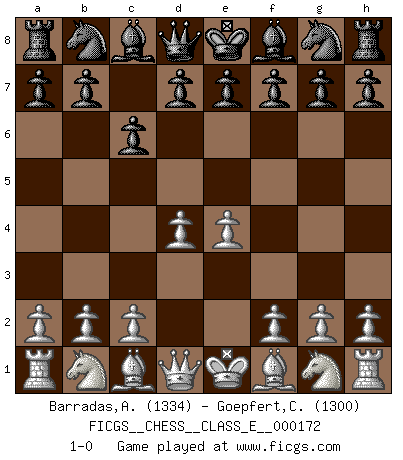 Last move : 1-0 2014 June 7 10:50:52 [Event "FICGS__CHESS__CLASS_E__000172"] [Site "FICGS"] [Date "2014.04.27"] [Round "1"] [White "Barradas,Anderson"] [Black "Goepfert,Christian"] [Result "1-0"] [WhiteElo "1334"] [BlackElo "1300"] 1.e4 c6 2.d4 1-0 This chess game has been lost on time (started : 2014.04.27 0:43:16) Caro-Kann defense Player White won this chess game. Follow this game move after move (download)War is the child of passion, passion is the child of narcissism and narcissism is the child. (...) Another game ? (Thibault de Vassal) Wenn Spassky eine Figur opfert kannst du genauso gut aufgeben. Aber wenn Tal eine Figur opfert, spiel weiter. Er könnte noch eine weitere opfern, und dann ... wer weiß? (Miguel Najdorf) En la perfecta combinación de Ajedrez como en una historia corta de primera clase, toda la trama y contra trama deberá conducir hacia un final sorprendente, el interes no es mitigado hasta el último momento. (Yates and Winter) Les échecs sont utiles à l'exercice de la faculté de penser et à celle de l'imagination. Car nous devons posséder une méthode élaborée pour atteindre des buts partout où nous devons conduire notre raison. (Leibnitz) Gambling : The sure way of getting nothing from something. (Wilson Mizner)