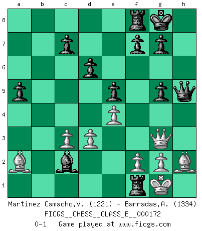 Last move : 0-1 2014 May 17 1:56:7 [Event "FICGS__CHESS__CLASS_E__000172"] [Site "FICGS"] [Date "2014.04.27"] [Round "1"] [White "Martinez Camacho,Victor Hugo"] [Black "Barradas,Anderson"] [Result "0-1"] [WhiteElo "1221"] [BlackElo "1334"] 1.e4 e5 2.Nf3 Nc6 3.Bb5 a6 4.Ba4 b5 5.Bb3 Nf6 6.O-O Bc5 7.d3 O-O 8.Bg5 h6 9.Bh4 Be7 10.Nc3 Nh7 11.Bg3 Bf6 12.a4 b4 13.Nd5 a5 14.Nxf6+ Qxf6 15.Qd2 Ng5 16.Nxg5 hxg5 17.Kh1 d6 18.h3 Nd4 19.Bc4 Qh6 20.Bh2 Bxh3 21.Rg1 Qh5 22.Qe3 Bd7 23.c3 bxc3 24.bxc3 Nc2 25.Qg3 Nxa1 26.Rxa1 Bxa4 27.Bd5 Rab8 28.Rf1 Bc2 29.Kg1 Rb1 30.Ba2 Rxf1+ 0-1 Ruy Lopez : Caro variation Kingside Castling by player White (move 6) Kingside Castling by player Black (move 7) Player Black won this chess game. Follow this game move after move (download)Chess is no whit inferior to the violin, and we have a large number of professional violinists. (Mikhail Botvinnik) Schach verlangt totale Konzentration. (Robert James Fischer) Ayuda a tus piezas para que ellas te puedan ayudar. (Paul Morphy) Celui qui prend des risques peut perdre, celui qui n'en prend pas perd toujours. (Xavier Tartacover) Some people are so afraid to die that they never begin to live. (Henry Van Dyke)