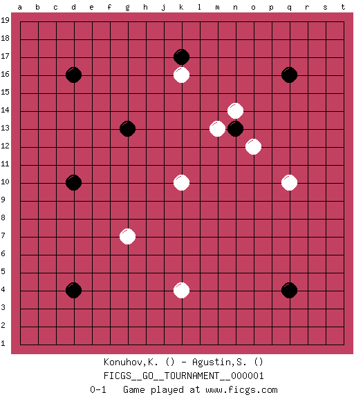 Last move : 0-1 2006 June 10 0:7:24 [Event "FICGS__GO__TOURNAMENT__000001"] [Site "FICGS"] [Date "2006.05.26"] [Round "1"] [Black "Konuhov,Konstantin"] [White "Agustin,Santos"] [Result "0-1"] 1.d4 k4 2.q16 k10 3.q4 q10 4.d10 k16 5.d16 g7 6.n13 o12 7.g13 m13 8.k17 n14 0-1 Here are the names of the openings (joseki) played in the four corners : Corner d4 : d4 g7 Hoshi (Hwajeom, Seongjeom, Xingwei`) 4-4 Point. The star or hoshi (4-4) point, emphasizing influence at the potential expense of territory. Player White won this Go (weiqi, baduk) game. Follow this game move after move (download)In the sound of the stone you can hear its purpose. (Pierre Audouard) If you work for a living, why do you kill yourself working ? (Tuco to a chicken in The Good, The Bad and The Ugly)