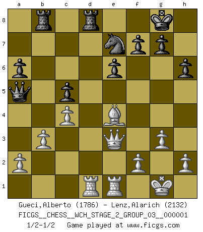 Last move : 1/2-1/2 2007 May 24 6:32:4 [Event "FICGS__CHESS__WCH_STAGE_2_GROUP_03__000001"] [Site "FICGS"] [Date "2007.02.15"] [Round "1"] [White "Gueci,Alberto"] [Black "Lenz,Alarich"] [Result "1/2-1/2"] [WhiteElo "1786"] [BlackElo "2132"] 1.e4 c5 2.Nf3 e6 3.d4 cxd4 4.Nxd4 Nc6 5.Nc3 Qc7 6.Be3 a6 7.Be2 Nf6 8.O-O Bb4 9.Na4 Be7 10.Nxc6 bxc6 11.Nb6 Rb8 12.Nxc8 Qxc8 13.e5 Nd5 14.Bc1 Bc5 15.c4 Ne7 16.b3 Qc7 17.Bb2 d6 18.exd6 Bxd6 19.g3 Be5 20.Bxe5 Qxe5 21.Re1 O-O 22.Qd7 Rfe8 23.Rad1 Qa5 24.Qd2 Qc7 25.Bf3 Red8 26.Qe2 c5 27.Be4 h6 28.Qe3 Qa5 1/2-1/2 Sicilian : Taimanov variation Kingside Castling by player White (move 8) Kingside Castling by player Black (move 21) This chess game ended in a draw. Follow this game move after move (download)By this measure (on the gap between Fischer & his contemporaries), I consider him the greatest world champion. (Garry Kasparov) Wer mein Gambit spielt, muß bereit sein, alle Brücken hinter sich abzubrechen. Es verändert den ganzen Menschen. Es wirkt wie ein Zauberstab und fördert verkümmerte, gute Charakter- eigenschaften wieder zu Tage. (Emil Joseph Diemer) Cualquier cambio de material en una posición debe venir por medio de un mate, una captura o promoción de Peón. (Purdy) Toute estimation doit être constamment réévaluée. (Jacob Estrin) God is an atheist. (Unknown)