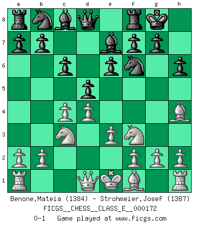 Last move : 0-1 2014 July 2 12:10:38 [Event "FICGS__CHESS__CLASS_E__000172"] [Site "FICGS"] [Date "2014.04.27"] [Round "1"] [White "Benone,Mateia"] [Black "Strohmeier,Josef"] [Result "0-1"] [WhiteElo "1384"] [BlackElo "1387"] 1.Nf3 d5 2.d4 Nf6 3.c4 e6 4.Nc3 Be7 5.Bg5 O-O 6.e3 h6 7.Bh4 c6 0-1 This chess game has been lost on time (started : 2014.04.27 0:43:16) Reti Opening Kingside Castling by player Black (move 5) Player Black won this chess game. Follow this game move after move (download)During a Chess competition a Chessmaster should be a combination of a beast of prey and a monk. (Alexander Alekhine) Ich hatte meine größten Erfolge, als ich 47 Jahre alt war. Kasparow war noch nicht mal 42 und hat das Schach schon im Stich gelassen. (Viktor Kortschnoi) Los tropiezos estan todos ahí en el tablero, esperando que se cometan. (Savielly Tartakover) Le génie consiste à savoir transgresser les règles au moment opportun. (Teichmann) Perception is reality. (Immanuel Kant)