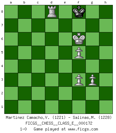 Last move : 1-0 2015 January 9 4:23:5 [Event "FICGS__CHESS__CLASS_E__000172"] [Site "FICGS"] [Date "2014.04.27"] [Round "1"] [White "Martinez Camacho,Victor Hugo"] [Black "Salinas,Marcelo"] [Result "1-0"] [WhiteElo "1221"] [BlackElo "1228"] 1.d4 Nc6 2.c4 d5 3.Nc3 dxc4 4.e4 Nxd4 5.Be3 c5 6.Nge2 Qb6 7.Nxd4 cxd4 8.Bxd4 Qb4 9.Qc2 Nf6 10.a3 Qd6 11.Be3 Bg4 12.f3 Be6 13.Be2 a6 14.Rd1 Qc7 15.O-O Rd8 16.Qa4+ Bd7 17.Qc2 e5 18.Nd5 Nxd5 19.Rxd5 Be6 20.Rxd8+ Qxd8 21.Rd1 Qc7 22.b3 b5 23.bxc4 Bxa3 24.Ra1 Qe7 25.cxb5 axb5 26.Bxb5+ Bd7 27.Qa4 Bb2 28.Bxd7+ Qxd7 29.Qa8+ Qd8 30.Qxd8+ Kxd8 31.Ra8+ Ke7 32.Rxh8 h6 33.Kf2 Ke6 34.Rb8 Ba3 35.Ra8 Bb4 36.Ra6+ Kd7 37.Bc1 Bc5+ 38.Ke2 g6 39.Be3 Bf8 40.Kd3 Ke7 41.Bc5+ Kd7 42.Bxf8 h5 43.Kc4 f5 44.exf5 Ke8 45.Rxg6 Kxf8 46.Kd5 Kf7 47.Kxe5 h4 48.g3 hxg3 49.hxg3 Ke7 50.Rd6 Kf7 51.Rd7+ Ke8 52.Ke6 Kf8 53.Kf6 Ke8 54.Rd6 Kf8 55.Rd8+ 1-0 This chess game has been lost on time (started : 2014.04.27 0:43:16) Queen's pawn : Lundin (Kevitz-Mikenas) defense Kingside Castling by player White (move 15) 10 pieces endgame at move 45 : White KRBPPPP , Black KPP WHITE : King + 1 Rook 1 Bishop 4 Pawns BLACK : King + 2 Pawns 9 pieces endgame at move 45 : White KRPPPP , Black KPP WHITE : King + 1 Rook 4 Pawns BLACK : King + 2 Pawns 8 pieces endgame at move 47 : White KRPPPP , Black KP WHITE : King + 1 Rook 4 Pawns BLACK : King + 1 Pawn 7 pieces endgame at move 48 : White KRPPP , Black KP WHITE : King + 1 Rook 3 Pawns BLACK : King + 1 Pawn 6 pieces endgame at move 49 : White KRPPP , Black K WHITE : King + 1 Rook 3 Pawns BLACK : King + Player White won this chess game. Follow this game move after move (download)A great player and a great example for many. His book My 60 Memorable Games had a big impact on me. It is a shame he didn't continue to enrich the world of chess with his unparalleled understanding after 1972. (Jan Timman, about Bobby Fischer's death) Ein typischer, sehr verbreiteter Gedankenschädling ist der, daß der betreffende Amateur von der Annanhme ausgeht, daß jeder einzelne Zug etwas zu leisten habe. (Aaron Nimzowitsch) Cuando me preguntan: -¿Cual es el secreto que te hace hacer mejores movidas que tus oponentes?, Yo respondo: Me da gusto que me pregunten eso, porque, como veran, hay una simple razón. Yo pienso mis propias movidas y dejo a mi oponente que el piense las suyas. (Alexander Alekhine) J'ai vu le vaincu d'Echecs jouer des années durant dans l'espoir de la fête de la victoire. Car tu es plus riche de ce qu'elle existe si même elle n'est point pour toi. Ainsi de la perle du fond des mers. (Antoine de Saint-Exupéry) The absolute truth is the thing that makes people laugh. (Carl Reiner)