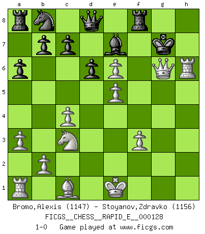 Last move : 1-0 2014 May 14 21:53:7 [Event "FICGS__CHESS__RAPID_E__000128"] [Site "FICGS"] [Date "2014.04.27"] [Round "1"] [White "Bromo,Alexis"] [Black "Stoyanov,Zdravko"] [Result "1-0"] [WhiteElo "1147"] [BlackElo "1156"] 1.d4 d6 2.c4 a6 3.Nc3 h6 4.Nf3 Bg4 5.e3 Nf6 6.Be2 e6 7.h3 Bh5 8.g4 Bg6 9.Bd3 Bxd3 10.Qxd3 Be7 11.a3 O-O 12.g5 hxg5 13.Nxg5 g6 14.h4 Ng4 15.f3 Nh6 16.Nxe6 Qd7 17.d5 Re8 18.e4 Kh7 19.h5 fxe6 20.hxg6+ Kxg6 21.e5 Nf5 22.Rh6+ Kg7 23.dxe6 Qd8 24.Qxf5 Rf8 25.Qg6+ 1-0 Old Indian defense Kingside Castling by player Black (move 11) Player White won this chess game. Follow this game move after move (download)I have added these principles to the law: get the Knights into action before both Bishops are developed. (Emanuel Lasker) Wenn ich Weiß habe gewinne ich weil ich Weiß habe, wenn ich Schwarz habe gewinne ich weil ich Bogoljubov bin. (Efim Bogoljubov) La última cosa en que Fischer estaba interesado era en tonterías, siempre y cuando el Ajedrez estuviera involucrado. (Elie Agur) Même si vous avez un bon coup à faire, regardez toujours s'il n'y en a pas un qui lui soit préférable. (Pedro Damiano) . 'gn is not allowed in chess unless n is an integer between 1 and 8 inclusive, where 1 and 8 are to interpreted as the standard numerals standing for integers in the ordered real-closed field R, with the *canonical* ordering. (As opposed to, say, an integer in the domain Z[2+i*sqrt(5)] or an integer in some exotic Grothendieck topos). (Normajean Yates)