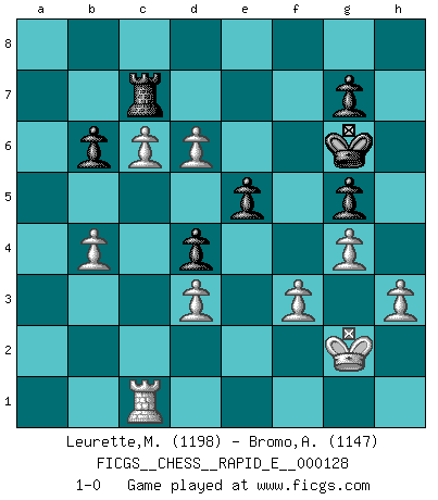 Last move : 1-0 2014 May 21 22:18:23 [Event "FICGS__CHESS__RAPID_E__000128"] [Site "FICGS"] [Date "2014.04.27"] [Round "1"] [White "Leurette,Marc-Antoine"] [Black "Bromo,Alexis"] [Result "1-0"] [WhiteElo "1198"] [BlackElo "1147"] 1.e4 e5 2.Nf3 Nc6 3.Bc4 h6 4.d3 Nf6 5.Nc3 a6 6.Be3 Bb4 7.Qd2 Qe7 8.a3 Ba5 9.b4 Bb6 10.Bxb6 cxb6 11.Nd5 Nxd5 12.Bxd5 O-O 13.O-O d6 14.c3 Be6 15.Bxe6 fxe6 16.c4 Nd4 17.Nxd4 exd4 18.a4 e5 19.g3 Qg5 20.Qxg5 hxg5 21.g4 Rf3 22.Rad1 Raf8 23.Kg2 b5 24.cxb5 axb5 25.axb5 b6 26.Rd2 R3f4 27.h3 Kh7 28.f3 Kg6 29.Rc2 R8f6 30.Rc6 d5 31.exd5 Rxc6 32.bxc6 Rf7 33.Rc1 Rc7 34.d6 1-0 King's pawn game Kingside Castling by player Black (move 12) Kingside Castling by player White (move 13) Player White won this chess game. Follow this game move after move (download)There just isn't enough televised Chess. (David Letterman) Eine Person mit durchschnittlichem IQ kann etwa eine ELO von 2000 erreichen. (Jonathan Levitt) Tu sabes que vas a perder. Aún cuando tenía la ventaja, yo sabía que iba a perder. - al estar jugando con Fischer (Andrew Soltis) Il n'y a pas eu de défaite parce que je ne crois pas que cet ordinateur ait jamais existé. IBM a triché en refusant d'imprimer les modes de recherche de la machine. C'est évident, pendant le match, des coups décisifs ont été joués par des êtres humains. Aujourd'hui, les meilleurs spécialistes en informatique ne peuvent toujours pas expliquer comment Deep-Blue a pu jouer contre la logique des ordinateurs. IBM a gagné une guerre de communication, mais ils sont incapables de prouver que l'ordinateur a gagné tout seul. (Garry Kasparov) The smarter you play, the luckier you'll be. (Mark Pilarski)