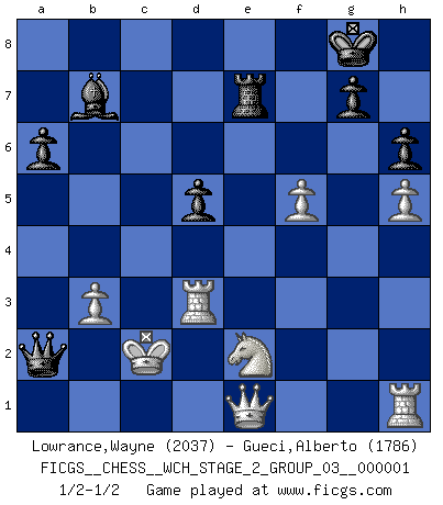 Last move : 1/2-1/2 2007 May 26 20:48:34 [Event "FICGS__CHESS__WCH_STAGE_2_GROUP_03__000001"] [Site "FICGS"] [Date "2007.02.15"] [Round "1"] [White "Lowrance,Wayne"] [Black "Gueci,Alberto"] [Result "1/2-1/2"] [WhiteElo "2037"] [BlackElo "1786"] 1.e4 c5 2.Nf3 d6 3.Nc3 Nf6 4.d4 cxd4 5.Nxd4 a6 6.Be3 e6 7.f3 b5 8.Qd2 Nbd7 9.O-O-O Bb7 10.g4 Nb6 11.a3 Be7 12.Kb1 Rc8 13.h4 Nfd7 14.g5 Ne5 15.Qe1 Qc7 16.f4 Nec4 17.Bxc4 Nxc4 18.Rd3 O-O 19.h5 d5 20.exd5 exd5 21.g6 h6 22.gxf7+ Rxf7 23.Ne6 Qd6 24.Bd4 Bf6 25.f5 Bxd4 26.Nxd4 b4 27.axb4 Qxb4 28.b3 Na3+ 29.Kc1 Re7 30.Nce2 Nxc2 31.Nxc2 Qa3+ 32.Kb1 Rxc2 33.Kxc2 Qa2+ 34.Kd1 Qa1+ 35.Kc2 Qa2+ 1/2-1/2 Sicilian Queenside Castling by player White (move 9) Kingside Castling by player Black (move 18) This chess game ended in a draw. Follow this game move after move (download)It is difficult to play against Einstein's theory --on his first loss to Fischer. (Mikhail Tal) Es ist nicht das erste mal, dass sich die FIDE dem Arabischen Geld gebeugt hat (über die FIDE WM 2004 in Lybien). (Larry Evans) El Ajedrez es un terrible juego. Si no controlas el centro, tu oponente tiene una posición mas holgada. Si tienes control del centro, ¡entonces realmente tu tienes algo de que preocuparte!. (Siegbert Tarrasch) Ce n'est pas pour s'amuser qu'il joue aux échecs : il célèbre un culte. (Vladimir Nabokov) If you ain't just a little scared when you enter a casino, you are either very rich or you haven't studied the games enough. (Pappy)