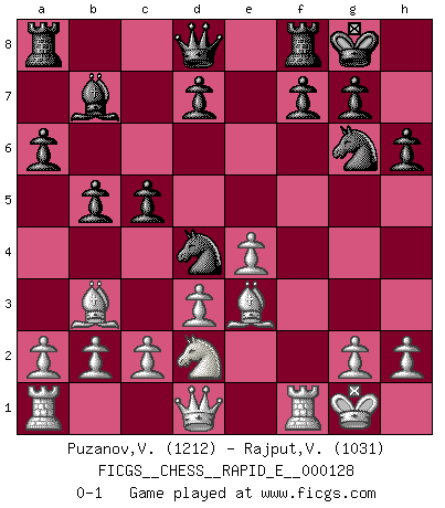 Last move : 0-1 2014 July 7 19:36:4 [Event "FICGS__CHESS__RAPID_E__000128"] [Site "FICGS"] [Date "2014.04.27"] [Round "1"] [White "Puzanov,Vasyl"] [Black "Rajput,Vishalsingh"] [Result "0-1"] [WhiteElo "1212"] [BlackElo "1031"] 1.e4 e5 2.Nf3 Nc6 3.Bb5 Nge7 4.Nc3 Ng6 5.d3 Bc5 6.O-O O-O 7.Bg5 Be7 8.Be3 a6 9.Bc4 h6 10.Nd5 b5 11.Bb3 Bb7 12.Nxe7+ Ncxe7 13.Nd2 Nc6 14.f4 exf4 15.Bxf4 Nd4 16.Be3 c5 0-1 Ruy Lopez : Cozio defense Kingside Castling by player White (move 6) Kingside Castling by player Black (move 6) Player Black won this chess game. Follow this game move after move (download)Let the perfectionist play postal. (Yasser Seirawan) Es gibt zwei Arten von Opfern: Korrekte und meine. (Mikhail Nekhemyevich Tal) Yo jugué Ajedrez con el y a veces le pude haber ganado solo que siempre devuelve su última jugada y juega la partida de manera diferente. (Mark Twain) Une platitude souvent récitée à propos des Echecs est qu'une des choses les plus difficiles à réaliser est de gagner une position gagnante. Cela ne manque pas de sens mais, pour ma part, j'ai toujours trouvé plus difficile de gagner une position perdante. (Tim Krabbe) A good book on your shelf is a friend that turns its back on you and remains a friend. (Author unknown)