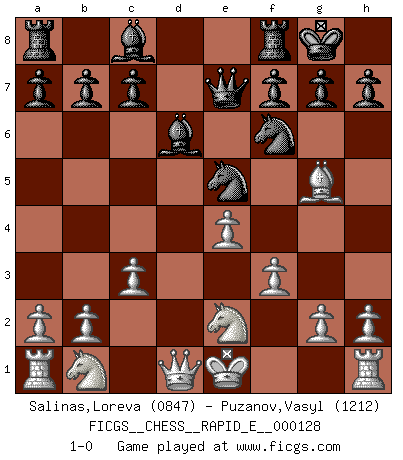 Last move : 1-0 2014 July 7 19:35:49 [Event "FICGS__CHESS__RAPID_E__000128"] [Site "FICGS"] [Date "2014.04.27"] [Round "1"] [White "Salinas,Loreva"] [Black "Puzanov,Vasyl"] [Result "1-0"] [WhiteElo "0847"] [BlackElo "1212"] 1.e3 e5 2.Bc4 d5 3.Bb3 Nf6 4.f3 Nc6 5.d4 Bd6 6.Ne2 O-O 7.dxe5 Nxe5 8.Bxd5 Nxd5 9.c3 Nf6 10.e4 Qe7 11.Bg5 1-0 Van't Kruijs Opening Kingside Castling by player Black (move 6) Player White won this chess game. Follow this game move after move (download)Chess is a sea in which a gnat may drink and an elephant may bathe. (Hindu proverb) Ich rechne überhaupt nicht voraus. Ich gewinne auch so. (Robert James Fischer) Por esta medida (el intervalo entre Fischer y sus contemporaneos), yo le considero el mas grande campeón mundial. (Garry Kasparov) La solitude du joueur d'Echecs à l'approche du mat est semblable à celle du condamné. (Francis Szpiner) Opportunities multiply as they are seized. (Sun Tzu)