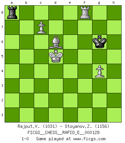 Last move : 1-0 2014 May 27 19:10:49 [Event "FICGS__CHESS__RAPID_E__000128"] [Site "FICGS"] [Date "2014.04.27"] [Round "1"] [White "Rajput,Vishalsingh"] [Black "Stoyanov,Zdravko"] [Result "1-0"] [WhiteElo "1031"] [BlackElo "1156"] 1.e4 c5 2.Nf3 Nc6 3.Bc4 e6 4.O-O Nf6 5.Re1 Ng4 6.h3 Nge5 7.Nxe5 Nxe5 8.Nc3 Nxc4 9.d4 cxd4 10.Qxd4 Nd6 11.e5 Nf5 12.Qc4 d5 13.exd6 Bxd6 14.Be3 Qc7 15.Qd3 Nh4 16.Bg5 Nf5 17.Qxf5 e5 18.Nb5 Qc5 19.Nxd6+ Qxd6 20.Rxe5+ Kf8 21.Qe4 f6 22.Rd5 Qe7 23.Qxe7+ Kxe7 24.Re1+ Kf7 25.Bf4 Be6 26.Rc5 Rac8 27.b4 Rxc5 28.bxc5 Bxa2 29.Ra1 Bd5 30.Rxa7 Rc8 31.Bd6 Ke6 32.g4 h6 33.f4 f5 34.Ra3 fxg4 35.hxg4 g6 36.Re3+ Kf7 37.Re7+ Kf6 38.Re5 Ra8 39.Rxd5 Ra4 40.Kf2 Rc4 41.Rd2 g5 42.fxg5+ hxg5 43.Kg3 Kg6 44.Be7 Kh6 45.Rd5 Rc3+ 46.Rd3 Rxc2 47.Rb3 Re2 48.Rb6+ Kg7 49.Rxb7 Kg6 50.Rb6+ Kf7 51.Bxg5 Re5 52.Rf6+ Kg8 53.Rf5 Re6 54.Bf4 Rc6 55.Bd6 Kg7 56.Kf4 Kg6 57.Ke5 Rc8 58.Kd5 Ra8 59.c6 Ra4 60.c7 Ra8 61.Rf8 1-0 Sicilian defense Kingside Castling by player White (move 4) 10 pieces endgame at move 42 : White KRBPPP , Black KRPP WHITE : King + 1 Rook 1 Bishop 3 Pawns BLACK : King + 1 Rook 2 Pawns 9 pieces endgame at move 46 : White KRBPP , Black KRPP WHITE : King + 1 Rook 1 Bishop 2 Pawns BLACK : King + 1 Rook 2 Pawns 8 pieces endgame at move 49 : White KRBPP , Black KRP WHITE : King + 1 Rook 1 Bishop 2 Pawns BLACK : King + 1 Rook 1 Pawn 7 pieces endgame at move 51 : White KRBPP , Black KR WHITE : King + 1 Rook 1 Bishop 2 Pawns BLACK : King + 1 Rook Player White won this chess game. Follow this game move after move (download)Chess books should be used as we use glasses: to assist the sight, although some players make use of them as if they thought they conferred sight. (Jose Raul Capablanca) Schach ist Leben. (Robert James Fischer) La única cosa que los jugadores de Ajedrez tienen en común, es el Ajedrez. (Lodewijk Prins) C'est la seule position que je connaisse où les deux camps sont mals. Propos prêtés à V. Anand. Think like a man of action, act like a man of thought. (Henri Louis Bergson)