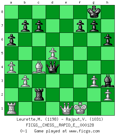 Last move : 0-1 2014 May 14 22:12:41 [Event "FICGS__CHESS__RAPID_E__000128"] [Site "FICGS"] [Date "2014.04.27"] [Round "1"] [White "Leurette,Marc-Antoine"] [Black "Rajput,Vishalsingh"] [Result "0-1"] [WhiteElo "1198"] [BlackElo "1031"] 1.e4 e5 2.Nf3 Nc6 3.Bc4 Bc5 4.c3 a6 5.d4 exd4 6.cxd4 Bb4+ 7.Bd2 Bxd2+ 8.Nbxd2 Nge7 9.Ng5 O-O 10.d5 Ne5 11.b3 h6 12.Ngf3 N5g6 13.O-O d6 14.Re1 Re8 15.e5 dxe5 16.Nxe5 Bf5 17.Nxg6 Nxg6 18.Rxe8+ Qxe8 19.Nf3 Rd8 20.Qe1 Qd7 21.Ne5 Nxe5 22.Qxe5 Re8 23.Qg3 Qe7 24.Qc3 Qg5 25.g3 Re4 26.f4 Rxf4 27.Kh1 Rf2 28.Kg1 Rc2 29.Qe1 Qf6 30.a4 Qd4+ 31.Kf1 Bh3+ 0-1 Giuoco Piano Kingside Castling by player Black (move 9) Kingside Castling by player White (move 13) Player Black won this chess game. Follow this game move after move (download)I have never in my life played the French Defence, which is the dullest of all openings. (Wilhelm Steinitz) Der beste Spieler in einem Turnier gewinnt es nie. Er landet auf Platz zwei oder drei. (Siegbert Tarrasch) El Ajedrez, como cualquier actividad creativa, solo puede existir a través del esfuerzo combinado de aquellos que tienen talento creativo y de aquellos que poseen la habilidad de organizar su trabajo creativo. (Mikhail Botvinnik) J'ai toujours senti une vague pitié pour l'homme qui ne connaît rien aux échecs, tout comme j'en aurais pour un homme ignorant de l'amour. Les Echecs, comme la musique ou comme l'amour, ont le pouvoir de rendre heureux. (Siegbert Tarrasch) Every man's memory is his private literature. (Aldous Huxley)