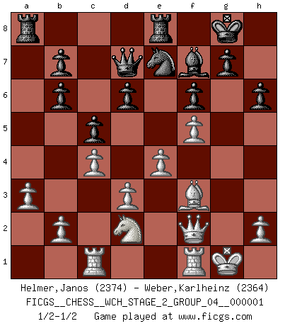 Last move : 1/2-1/2 2007 May 1 19:2:57 [Event "FICGS__CHESS__WCH_STAGE_2_GROUP_04__000001"] [Site "FICGS"] [Date "2007.02.15"] [Round "1"] [White "Helmer,Janos"] [Black "Weber,Karlheinz"] [Result "1/2-1/2"] [WhiteElo "2374"] [BlackElo "2364"] 1.c4 e5 2.Nc3 Nf6 3.Nf3 Nc6 4.g3 Bb4 5.Bg2 O-O 6.O-O d6 7.d3 Ba5 8.Bg5 h6 9.Bxf6 Qxf6 10.Nd5 Qd8 11.a3 Bb6 12.e3 Ne7 13.Nxb6 axb6 14.Nd2 c6 15.Rc1 Be6 16.Qe2 Qd7 17.f4 Rfe8 18.e4 exf4 19.gxf4 f6 20.f5 Bf7 21.Qf2 c5 22.Bf3 1/2-1/2 English Opening Kingside Castling by player Black (move 5) Kingside Castling by player White (move 6) This chess game ended in a draw. Follow this game move after move (download)Your body has to be in top condition. Your Chess deteriorates as your body does. You can't separate body from mind. (Bobby Fischer) Offener Brief an US-Präsident Bush anlässlich der Verhaftung Bobby Fishers: Verhaften Sie mich. Stecken Sie mich in dieselbe Zelle wie Bobby Fisher und geben Sie uns ein Schachspiel mit. (Boris Vassilievich Spassky) Mis oponentes también hacen buenas movidas. A veces yo no tomo esas cosas en consideración. (Bobby Fischer) Votre prénom est 'Tactique', votre deuxième prénom est 'Tactique' et votre nom est 'Tactique'. (Ken Smith) All art requires courage. (Anne Tucker)