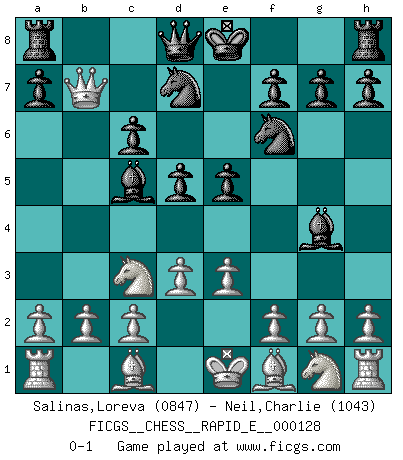 Last move : 0-1 2014 June 5 22:45:43 [Event "FICGS__CHESS__RAPID_E__000128"] [Site "FICGS"] [Date "2014.04.27"] [Round "1"] [White "Salinas,Loreva"] [Black "Neil,Charlie"] [Result "0-1"] [WhiteElo "0847"] [BlackElo "1043"] 1.e3 d5 2.Qf3 Nf6 3.Nc3 c6 4.d3 Bg4 5.Qf4 Nbd7 6.Qb4 e5 7.Qxb7 Bc5 0-1 This chess game has been lost on time (started : 2014.04.27 13:36:52) Van't Kruijs Opening Player Black won this chess game. Follow this game move after move (download)Mistrust is the most necessary characteristic of the Chess player. (Siegbert Tarrasch) Kasparov stellt für gewöhnlich die Regeln auf und bricht sie dann selbst wieder. (Alexej Shirov) Los errores estan ahí, esperando a que se cometan. (Savielly Tartakower) Le joueur d'Echecs qui veut atteindre le top est obligé de développer son propre credo créatif. Alexeï Stepanovicth Souétine. Il est facile d'écrire des livres ! Ce qui est difficile, c'est de jouer ! (Alexeï Stepanovicth Souétine) Experiences are the keys to life. (Daniel Parmet)