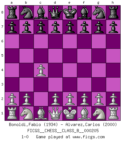Last move : 1-0 2014 June 10 22:58:4 [Event "FICGS__CHESS__CLASS_B__000205"] [Site "FICGS"] [Date "2014.05.01"] [Round "1"] [White "Bonoldi,Fabio"] [Black "Alvarez,Carlos"] [Result "1-0"] [WhiteElo "1934"] [BlackElo "2000"] 1.c4 1-0 This chess game has been lost on time (started : 2014.05.01 15:17:39) English Opening Player White won this chess game. Follow this game move after move (download)I believe that Chess possesses a magic that is also a help in advanced age. A rheumatic knee is forgotten during a game of Chess and other events can seem quite unimportant in comparison with a catastrophe on the chessboard. (Vlastimil Hort) Frage: Was machen Sie mit den Preisen? Anwort: Ich habe Angst, dass meine Freundin davon neue Kleider kauft. (Loek van Wely) El Ajedrez es despiadado: debes de estar preparado para matar gente. (Nigel Short) C'est la seule position que je connaisse où les deux camps sont mals. Propos prêtés à V. Anand. May I never be complete. May I never be content. May I never be perfect. Deliver me, Tyler, from being perfect and complete. (Chuck Palahniuk, Fight Club)