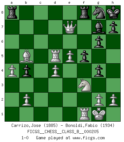 Last move : 1-0 2014 August 21 17:45:31 [Event "FICGS__CHESS__CLASS_B__000205"] [Site "FICGS"] [Date "2014.05.01"] [Round "1"] [White "Carrizo,Jose"] [Black "Bonoldi,Fabio"] [Result "1-0"] [WhiteElo "1885"] [BlackElo "1934"] 1.e4 g6 2.d4 Bg7 3.Nc3 d6 4.f4 a6 5.Nf3 b5 6.Bd3 Bb7 7.O-O Nd7 8.e5 e6 9.Ne4 Qe7 10.a4 b4 11.c3 Bxe4 12.Bxe4 d5 13.Bd3 Nh6 14.Qe2 a5 15.f5 exf5 16.cxb4 axb4 17.Bg5 Qe6 18.Rac1 O-O 19.Rxc7 f6 20.Bb5 fxg5 21.Bxd7 Qb6 22.Rc5 Qd8 23.Rxd5 Qe7 24.Qc4 Kh8 25.Qc5 Ng8 26.Bb5 g4 27.Qxe7 1-0 Robatsch defense : Pseudo-Austrian attack Kingside Castling by player White (move 7) Kingside Castling by player Black (move 18) Player White won this chess game. Follow this game move after move (download)Fischer was a master of clarity and a king of artful positioning. His opponents would see where he was going but were powerless to stop him. (Bruce Pandolfini) Frage des Reporters: -Worin besteht das Ziel von Gambiteröffnungen? Antwort: -Auf Kosten der Partie einen Ruf als Angriffspieler zu erwerben.- (Siegbert Tarrasch) Después de la respuesta de las negras a 1.e4 con 1..e5, se quedan siempre tratando de entrar dentro del juego. (Howard Staunton) On n'a jamais que l'âge auquel on a commence à jouer aux échecs car après on cesse de vieillir. (Capablanca) Creativity is allowing yourself to make mistakes. Art is knowing which ones to keep. (Scott Adams)