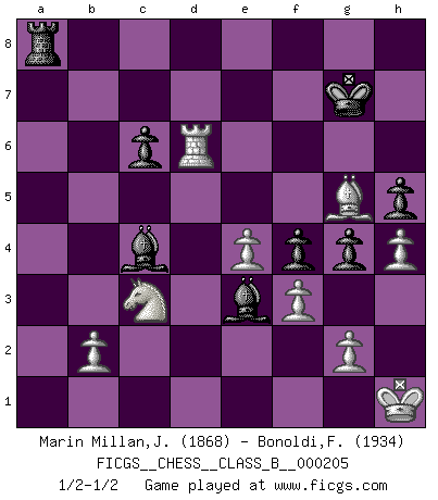 Last move : 1/2-1/2 2015 February 4 0:58:36 [Event "FICGS__CHESS__CLASS_B__000205"] [Site "FICGS"] [Date "2014.05.01"] [Round "1"] [White "Marin Millan,Jose Antonio"] [Black "Bonoldi,Fabio"] [Result "1/2-1/2"] [WhiteElo "1868"] [BlackElo "1934"] 1.e4 g6 2.d4 Bg7 3.Nf3 d6 4.Nc3 a6 5.Be3 b5 6.Bd3 Nd7 7.Ne2 Bb7 8.Ng3 Ngf6 9.h3 O-O 10.O-O e5 11.dxe5 Nxe5 12.Nxe5 dxe5 13.a4 Qd7 14.axb5 axb5 15.Qe2 Bc6 16.Rad1 Rfd8 17.Ra1 Ne8 18.Rfd1 Nd6 19.Bd2 f5 20.Rxa8 Rxa8 21.Bb4 f4 22.Nf1 Qe8 23.c4 Rb8 24.Qc2 bxc4 25.Bxc4+ Nxc4 26.Qxc4+ Kh8 27.Bc3 Rc8 28.Nh2 Bb5 29.Qc5 Qc6 30.Rd5 Qxc5 31.Rxc5 Bd3 32.f3 h5 33.Nf1 c6 34.Nd2 Bb5 35.Nb1 Kh7 36.Bxe5 Bf8 37.Rc1 g5 38.Nc3 Ba6 39.h4 Re8 40.Ra1 Bc5+ 41.Kh1 Bc4 42.Bf6 g4 43.Ra4 Bd3 44.Ra5 Bf2 45.Ra1 Be3 46.Rd1 Bc4 47.Rd7+ Kg6 48.Bg5 Ra8 49.Rd6+ Kg7 50.Rd7+ Kg6 51.Rd6+ Kg7 1/2-1/2 Robatsch (Modern) defense Kingside Castling by player Black (move 9) Kingside Castling by player White (move 10) This chess game ended in a draw. Follow this game move after move (download)If I win a tournament, I win it by myself. I do the playing. Nobody helps me. (Bobby Fischer) Es hat in meinem Leben Zeiten gegeben, da ich sehr nahe daran war zu glauben, daß ich auch nicht eine einzige Schachpartie verlieren könnte. (José Raúl Capablanca) Yo adoro todas la posiciones. Denme una partida posicional difícil, y la jugaré. Pero posiciones totalmente ganadas, no las tolero. (Hein Donner) Le joueur d'Echecs qui veut atteindre le top est obligé de développer son propre credo créatif. Alexeï Stepanovicth Souétine. Il est facile d'écrire des livres ! Ce qui est difficile, c'est de jouer ! (Alexeï Stepanovicth Souétine) Wawaweewa ! (Borat: Cultural learnings of America for make benefit glorious nation of Kazakhstan)