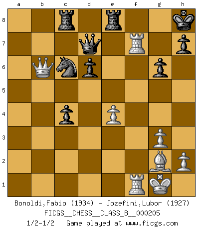 Last move : 1/2-1/2 2014 November 27 10:46:30 [Event "FICGS__CHESS__CLASS_B__000205"] [Site "FICGS"] [Date "2014.05.01"] [Round "1"] [White "Bonoldi,Fabio"] [Black "Jozefini,Lubor"] [Result "1/2-1/2"] [WhiteElo "1934"] [BlackElo "1927"] 1.c4 c5 2.g3 g6 3.Bg2 Bg7 4.Nc3 Nc6 5.e4 e5 6.Nge2 Nge7 7.d3 d6 8.O-O O-O 9.Be3 Nd4 10.Qd2 Bg4 11.f4 Qd7 12.Rf2 Bxe2 13.Nxe2 Nxe2+ 14.Qxe2 exf4 15.Rxf4 Nc6 16.Raf1 Be5 17.R4f2 f6 18.Qd2 a6 19.a3 b5 20.b4 Nd4 21.Rb1 Rac8 22.Qa2 Kh8 23.Rc1 Rfe8 24.Bf4 Nc6 25.Bxe5 Nxe5 26.Rxf6 cxb4 27.axb4 Nxd3 28.Rcf1 bxc4 29.Qxa6 Nxb4 30.Qb6 Nc6 31.Rf7 1/2-1/2 English : Symmetrical variation Kingside Castling by player White (move 8) Kingside Castling by player Black (move 8) This chess game ended in a draw. Follow this game move after move (download)White lost because he failed to remember the right continuation and had to think up the moves himself. (Siegbert Tarrasch) Spiel ein langweiliges Spiel zu Ende und lustige Dinge können passieren. (Hans Ree) Una mala movida nulifica cuarenta buenas. (Horowitz) Echiquier : carré parfait, comme la Jérusalem nouvelle décrite par l'auteur de l'Apocalypse, huit cases sur huit, exaltation du chiffre 4, symbole du cosmos aux quatre horizons... où le noir et le blanc, l'ombre et la lumière, le mal et le bien s'entremêlent et se conjuguent. (Robert Couffignal, Le Gambit du poète) A clear conscience is usually the sign of a bad memory. (Unknown)