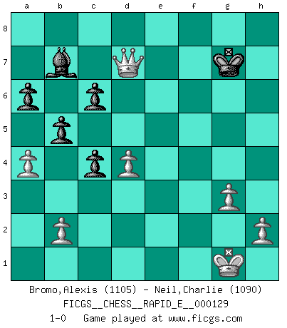 Last move : 1-0 2014 June 29 11:16:22 [Event "FICGS__CHESS__RAPID_E__000129"] [Site "FICGS"] [Date "2014.05.05"] [Round "1"] [White "Bromo,Alexis"] [Black "Neil,Charlie"] [Result "1-0"] [WhiteElo "1105"] [BlackElo "1090"] 1.d4 d5 2.c4 e6 3.a3 dxc4 4.Nc3 c6 5.e4 b5 6.a4 a6 7.Nf3 Bb4 8.Bd2 Ne7 9.Bg5 Nd7 10.Be2 Qa5 11.Bd2 Qc7 12.e5 Nf5 13.O-O O-O 14.Qc2 Rd8 15.g3 Bb7 16.Ne4 Be7 17.Bg5 h6 18.Bxe7 Nxe7 19.Nh4 Nf8 20.f4 Nd5 21.f5 Ne3 22.Qc3 Nxf1 23.Rxf1 exf5 24.Nxf5 Ne6 25.Nfd6 Ng5 26.Nxg5 hxg5 27.Bh5 g6 28.Bxg6 fxg6 29.Qc2 Kg7 30.Rf7+ Qxf7 31.Nxf7 Kxf7 32.Qe4 Rd5 33.Qf3+ Kg7 34.Qf6+ Kg8 35.Qxg6+ Kh8 36.Qh5+ Kg8 37.Qxg5+ Kh8 38.Qf6+ Kg8 39.e6 Rad8 40.Qf7+ Kh8 41.e7 R5d7 42.e8Q+ Rxe8 43.Qxe8+ Kg7 44.Qxd7+ 1-0 Queen's gambit declined Kingside Castling by player White (move 13) Kingside Castling by player Black (move 13) Promotion Queen by player White (move 42) Player White won this chess game. Follow this game move after move (download)I'm not afraid of Spassky. The world knows I'm the best. You don't need a match to prove it. (Bobby Fischer) Ohne Fehler kann es keine Brillanz geben. (Emanuel Lasker) Después de una mala apertura, hay una esperanza en el juego medio. Pero una vez que estas en finales, el momento de la verdad ha llegado. (Edmar Mednis) Assurément je connaissais par expérience le mystérieux attrait de ce jeu royal, le seul entre tous les jeux inventés par les hommes qui échappe souverainement à la tyrannie du hasard, le seul où l'on ne doive sa victoire qu'à son intelligence ou plutôt à une certaine forme d'intelligence. Mais n'est-ce pas déjà le limiter injurieusement que d'appeler les échecs un jeu ? N'est-ce pas une science, un art ou quelque chose qui, comme le cercueil de Mahomet entre ciel et terre, est suspendu entre l'un et l'autre, et qui réunit un nombre incroyable de contraires ? [...] C'est une pensée qui ne mène à rien, une mathématique qui n'établit rien, un art qui ne laisse pas d'uvre, une architecture sans matière; et il l'a prouvé néanmoins qu'il était plus durable, à sa manière, que les livres ou que tout autre monument, ce jeu unique qui appartient à tous les peuples et à tous les temps, et dont personne ne sait quel dieu en fit don à la terre pour tuer l'ennui, pour aiguiser l'esprit et stimuler l'âme. Où commence-t-il, où finit-il ? (Stefan Zweig) Looking at the proliferation of personal web pages on the Net, it looks like very soon everyone on Earth will have 15 megabytes of fame. (M.G. Sriram)