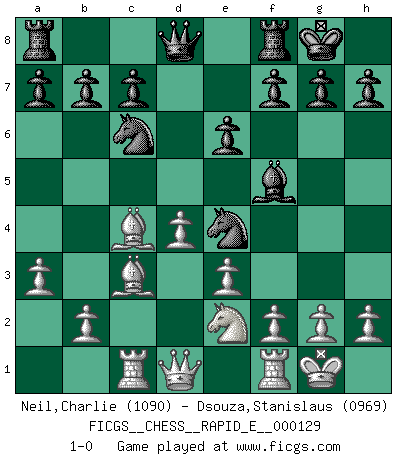 Last move : 1-0 2014 June 19 23:30:5 [Event "FICGS__CHESS__RAPID_E__000129"] [Site "FICGS"] [Date "2014.05.05"] [Round "1"] [White "Neil,Charlie"] [Black "Dsouza,Stanislaus"] [Result "1-0"] [WhiteElo "1090"] [BlackElo "0969"] 1.d4 d5 2.c4 dxc4 3.Nc3 Nf6 4.e3 Bf5 5.Bxc4 e6 6.Nge2 Nc6 7.O-O Bb4 8.Bd2 Ne4 9.a3 Bxc3 10.Bxc3 O-O 11.Rc1 1-0 This chess game has been lost on time (started : 2014.05.05 21:56:33) Queen's gambit accepted Kingside Castling by player White (move 7) Kingside Castling by player Black (move 10) Player White won this chess game. Follow this game move after move (download)What would Chess be without silly mistakes ? (Kurt Richter) Es ist peinlich, dass ich nie Weltmeister wurde. Es wäre leicht, Leonid Breschnjew als Ursache vorzuschieben, dessen Apparat den Vorzeigekommunisten Anatoli Karpow in allem unterstützte. Aber Garri Kasparow zum Beispiel, der ebenfalls von den Sowjets unerwünscht war, hat trotz der Widerstände den WM-Titel erobert. (Viktor Kortschnoi) Yo no le temo a Spassky. Todos saben que yo soy el mejor. Uno no necesita un torneo para probarlo. (Bobby Fischer) Seul un grand joueur sait à quel point il joue faiblement. (Xavier Tartacover) I just play for fun. (Anna Kournikova)