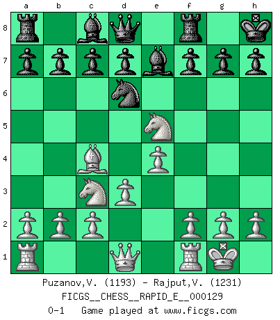 Last move : 0-1 2014 June 17 22:59:48 [Event "FICGS__CHESS__RAPID_E__000129"] [Site "FICGS"] [Date "2014.05.05"] [Round "1"] [White "Puzanov,Vasyl"] [Black "Rajput,Vishalsingh"] [Result "0-1"] [WhiteElo "1193"] [BlackElo "1231"] 1.e4 e5 2.Nf3 Nc6 3.Bb5 Bd6 4.O-O Nf6 5.Nc3 O-O 6.d3 Ne7 7.Bg5 Ne8 8.Bc4 Kh8 9.Bxe7 Bxe7 10.Nxe5 Nd6 0-1 Ruy Lopez (Spanish Opening) Kingside Castling by player White (move 4) Kingside Castling by player Black (move 5) Player Black won this chess game. Follow this game move after move (download)Tactics flow from a superior position. (Bobby Fischer) Schach ist gnadenlos. Du mußt bereit sein zu töten. (Nigel Short) Prefiero perder una partida realmente buena, que ganar una mala. (David Levy) Le temps de noter son nom sur la feuille de partie, j'étais déjà en zeitnot ! D'un modeste amateur apparié lors de la première ronde d'un open contre le grand-maître Azmaïparashvili. If I had no sense of humor, I would long ago have committed suicide. (Mahatma Gandhi)