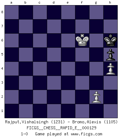 Last move : 1-0 2014 June 5 22:14:46 [Event "FICGS__CHESS__RAPID_E__000129"] [Site "FICGS"] [Date "2014.05.05"] [Round "1"] [White "Rajput,Vishalsingh"] [Black "Bromo,Alexis"] [Result "1-0"] [WhiteElo "1231"] [BlackElo "1105"] 1.e4 e5 2.Nf3 Nc6 3.Bc4 h6 4.O-O Nf6 5.Re1 Bc5 6.h3 d6 7.Nc3 a6 8.a4 Be6 9.Bxe6 fxe6 10.Na2 O-O 11.c3 d5 12.exd5 exd5 13.Nxe5 Nxe5 14.Rxe5 Qd6 15.d4 Bb6 16.b3 Rae8 17.f4 Ne4 18.Be3 c5 19.Qd3 cxd4 20.Bxd4 Bxd4+ 21.Qxd4 Rxe5 22.fxe5 Qc5 23.Rd1 Qxd4+ 24.cxd4 a5 25.Rc1 Ng3 26.Rc2 Nf5 27.Rc5 Nxd4 28.Rxd5 Nxb3 29.Rb5 Nd2 30.Rxb7 Rf1+ 31.Kh2 Rf2 32.Nc3 Nf3+ 33.Kg3 Rc2 34.Nb5 Nxe5 35.Ra7 Nc6 36.Ra6 Kf7 37.Nd6+ Ke6 38.Nb7 Kd7 39.Nxa5 Rc3+ 40.Kh2 Nxa5 41.Rxa5 Rc4 42.Ra7+ Rc7 43.Ra8 Rc8 44.Ra5 Kc6 45.Rf5 Ra8 46.a5 Kd6 47.Rf7 Rxa5 48.Rxg7 h5 49.Rg6+ Ke7 50.h4 Kf7 51.Rg3 Kf6 52.Rf3+ Rf5 53.Rxf5+ Kxf5 54.Kg3 Kg6 55.Kf4 Kf6 56.Ke4 Kg6 57.Ke5 Kg7 58.Kf5 Kh6 59.Kf6 1-0 King's pawn game Kingside Castling by player White (move 4) Kingside Castling by player Black (move 10) 10 pieces endgame at move 40 : White KRPPP , Black KRNPP WHITE : King + 1 Rook 3 Pawns BLACK : King + 1 Rook 1 Knight 2 Pawns 9 pieces endgame at move 41 : White KRPPP , Black KRPP WHITE : King + 1 Rook 3 Pawns BLACK : King + 1 Rook 2 Pawns 8 pieces endgame at move 47 : White KRPP , Black KRPP WHITE : King + 1 Rook 2 Pawns BLACK : King + 1 Rook 2 Pawns 7 pieces endgame at move 48 : White KRPP , Black KRP WHITE : King + 1 Rook 2 Pawns BLACK : King + 1 Rook 1 Pawn 6 pieces endgame at move 53 : White KRPP , Black KP WHITE : King + 1 Rook 2 Pawns BLACK : King + 1 Pawn 5 pieces endgame at move 53 : White KPP , Black KP WHITE : King + 2 Pawns BLACK : King + 1 Pawn Player White won this chess game. Follow this game move after move (download)Methodical thinking is of more use in Chess than inspiration. (C. J. S. Purdy) Ein Schachspiel besteht aus drei Phasen: Die erste, wenn du hofftst den Vorteil zu haben, die zweite, wenn du glaubst einen Vorteil zu haben, und die dritte.... wenn du weißt Du wirst verlieren. (Savielly Grigorievitsch Tartakower) En el Ajedrez, tal como en la vida, las bendiciones de hoy pueden ser el veneno del mañana. (Assaic) Je fais ceci parce que dans cinquante coups j'obtiendrai cela; je m'appelle Mikhail Moisevitch Botvinnik. (Botvinnik) Be who you are, and say what you feel because those who mind don't matter, and those who matter don't mind. (Dr Seuss)