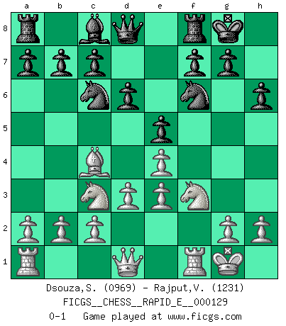 Last move : 0-1 2014 June 24 23:49:54 [Event "FICGS__CHESS__RAPID_E__000129"] [Site "FICGS"] [Date "2014.05.05"] [Round "1"] [White "Dsouza,Stanislaus"] [Black "Rajput,Vishalsingh"] [Result "0-1"] [WhiteElo "0969"] [BlackElo "1231"] 1.e4 e5 2.Nf3 Nc6 3.Bc4 h6 4.d3 Bc5 5.O-O Nf6 6.Be3 Bxe3 7.fxe3 O-O 8.Nc3 d6 0-1 This chess game has been lost on time (started : 2014.05.05 21:56:33) King's pawn game Kingside Castling by player White (move 5) Kingside Castling by player Black (move 7) Player Black won this chess game. Follow this game move after move (download)I thought the most common mistake [in chess] was the first one: Learning the game :P (Garvin Gray, FICGS forum) Es tut gut, die Entwicklungsperiode von, [...] demokratischem Geist durchdringen zu lassen. Wie undemokratisch wäre es doch beispielsweise, den einen Offizier große Spaziertouren vornehmen zu lassen, während die anderen zu Hause säßen und sich entsetzlich langweilten. (Aaron Nimzowitsch) Si el Ajedrez es una ciencia, es la mas inexacta. Si el Ajedrez es un arte, es demasiado inexacto para ser visto como tal. Si el Ajedrez es un deporte, es demasiado esotérico. Si el Ajedrez es un juego, es demasiado exigente para ser solo un juego. Si el Ajedrez es una aventura, es una muy demandante. Si el Ajedrez es una pasión, es una muy gratificante. Si el Ajedrez es la vida, es una muy triste. (Anónimo) Les échecs, c'est l'imagination. (David Bronstein) Internal peace cannot coexist with external war. (Don Groves)