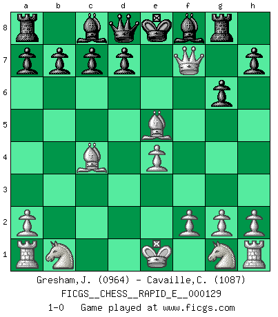 Last move : 1-0 2014 May 9 22:41:36 [Event "FICGS__CHESS__RAPID_E__000129"] [Site "FICGS"] [Date "2014.05.05"] [Round "1"] [White "Gresham,Jonathan"] [Black "Cavaille,Cedric"] [Result "1-0"] [WhiteElo "0964"] [BlackElo "1087"] 1.e4 e5 2.d4 exd4 3.c3 dxc3 4.Bc4 cxb2 5.Bxb2 Nc6 6.Qh5 g6 7.Qf3 Nf6 8.Bxf6 Ne5 9.Bxe5 Rg8 10.Qxf7+ 1-0 Danish gambit Player White won this chess game. Follow this game move after move (download)Chess is life. (Bobby Fischer) Glücklicherweise sind Großmeister Ruben Fines reine Schachbücher weniger phallozentrisch [als seine Schachpsychologie] und deswegen auch weniger lächerlich. (Nigel Short) ¿Que sería del Ajedrez sin errores graciosos?. (Kurt Richter) Shah mat. Le roi est mort. Cri de fierté d'un joueur venant de terrasser son adversaire, courtoisement, sans effusion de sang. The worth of a book is to be measured by what you can carry away from it. (James Bryce)
